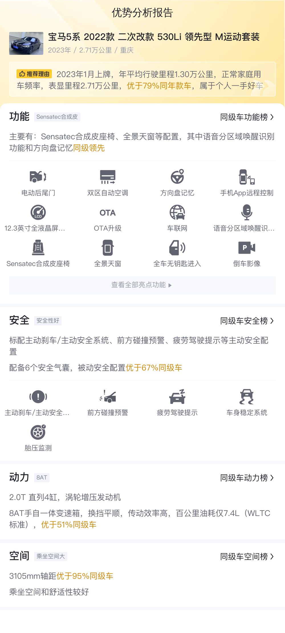 综上所述的新车含税价、用车成本、市场行情、优势分析、同款比价等数据仅供参考。在配置部分,因为二手车非标品,车辆可能会存在配置改装的情况,具体车况信息需要线下结合车辆实际情况进行综合参考。