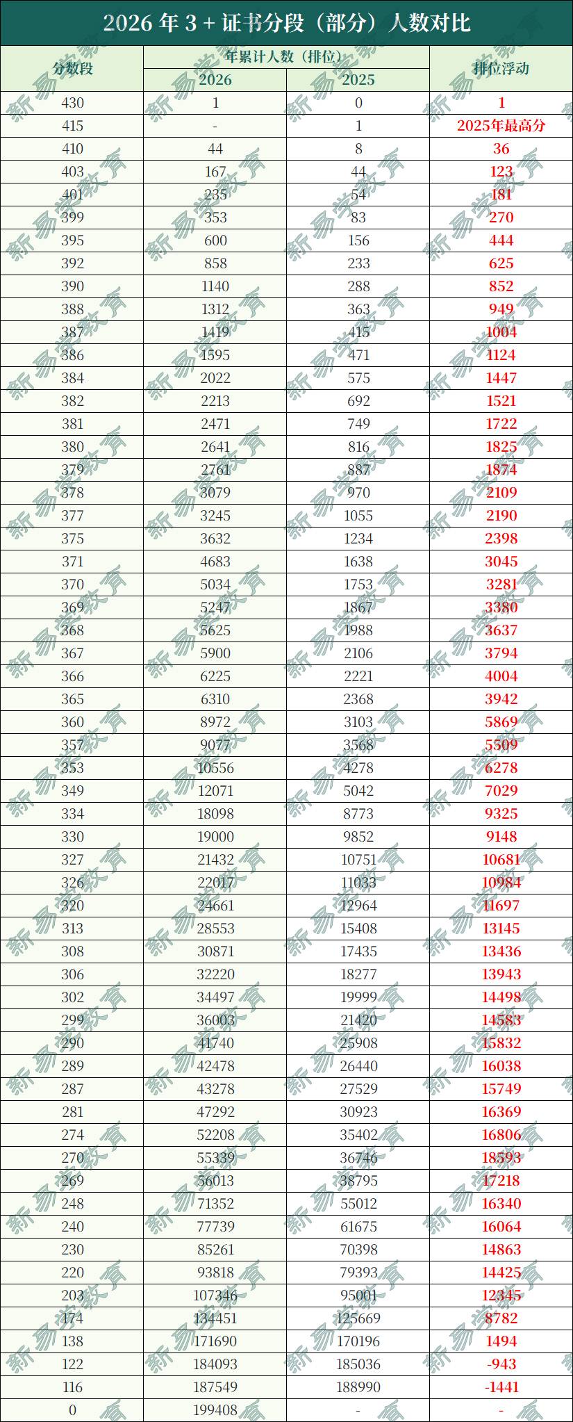 继续回到正题,新易学小编经过一番收集,整理了2026年3+证书高考多个分数段的排位情况,以及和2025年同分排位的对比!(数据为考生提供)