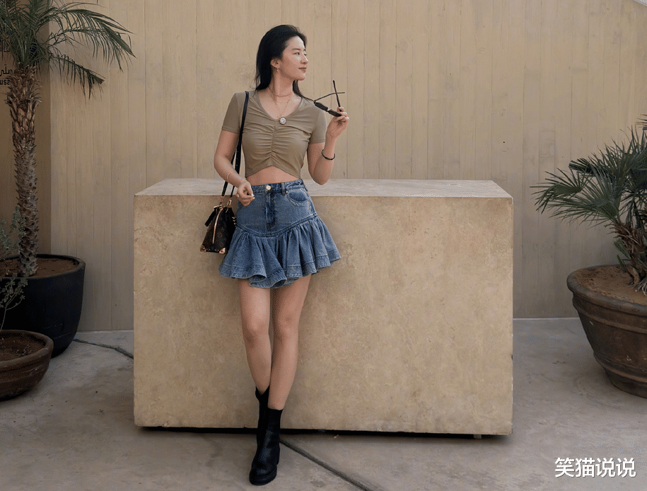 照片中的刘亦菲穿着石灰色V领露肚脐短袖的上衣,搭配牛仔A字短裙与黑色小短靴,秀出了超长大长腿,多了几分热情而火辣的风格。刘亦菲披散着长发,对着镜头歪头微笑拍照,看起来心情很不错的样子。