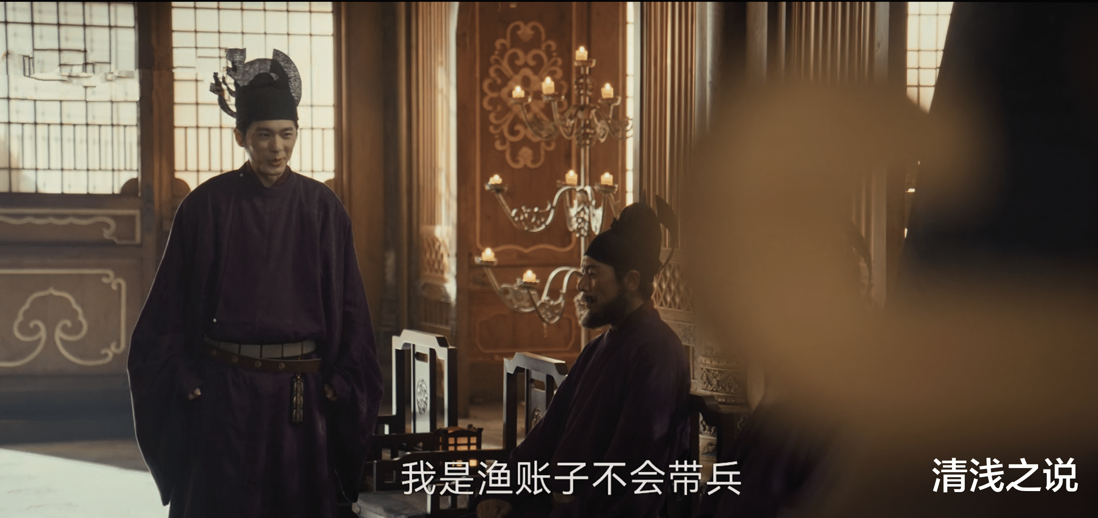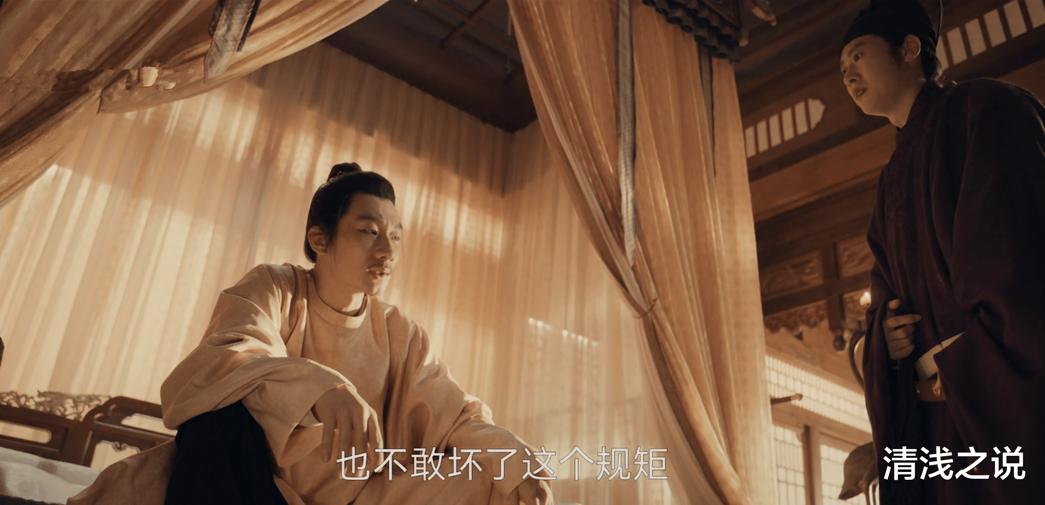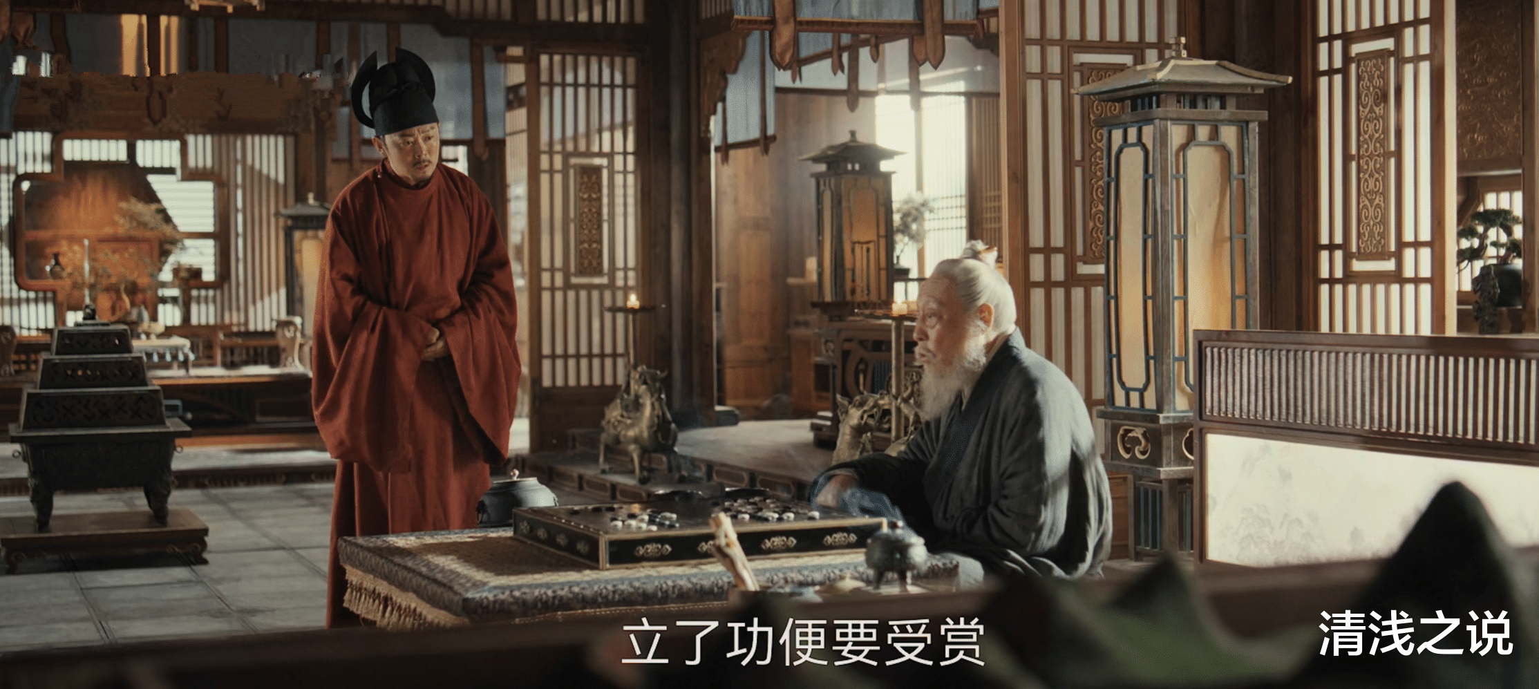 胡进思虽没当场反驳,却有意考考他一直看好的钱弘俶,问他平息程昭悦之乱是有功还是无功?水丘昭券暗示钱弘俶不要掉到胡进思的陷阱里,不管他选择哪个都不好收场,说有功吧国库没钱赏,说没功吧将士寒心。钱弘俶很聪明,即使没有水丘昭券的提醒应该也知道该怎么做,他假装胡闹,说他是渔账子不会带兵,只是打过许多人的板子,论功赏赐这活他可干不来。