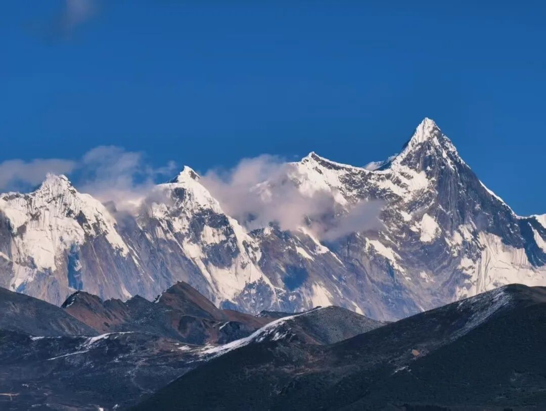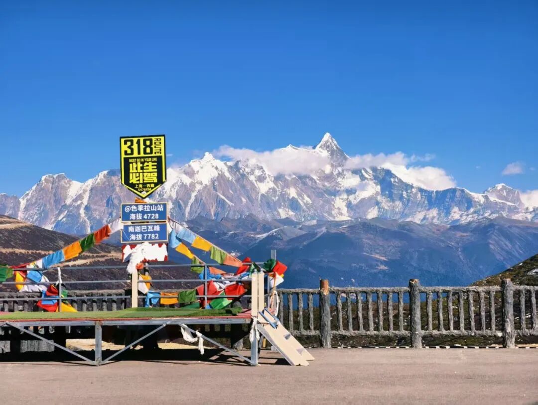 雪山正对观景台,山体巍峨、终年积雪,常伴冰川与云雾,晴天时雪山轮廓清晰,与318里程碑同框超震撼。