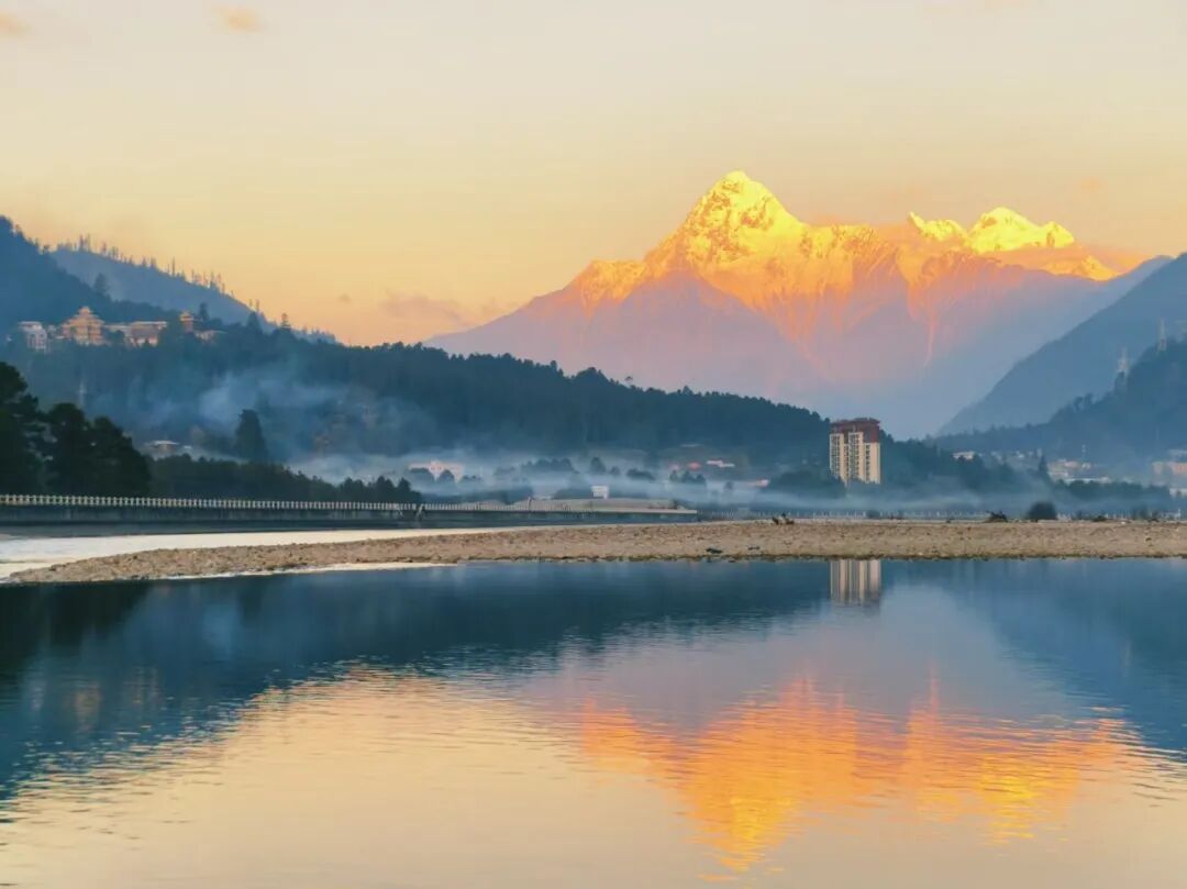 金色的晨光如画笔,从峰尖开始,将洁白的雪山一寸寸染成金黄,而倒映在静谧的帕隆藏布江水面上的,是另一个同样瑰丽的世界。那一刻,你会明白什么叫“身在人间,眼在天堂”。