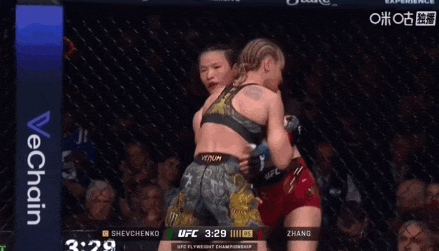 张伟丽面对六边形全能运动员舍甫琴科时,全程一直处于被动状态,多次被舍甫琴科抱摔压在身下,即使后续张伟丽加强了站立进攻,但还是不敌对手的反击。舍甫琴科的膝击、抱摔以及防守像一堵密不透风的墙。