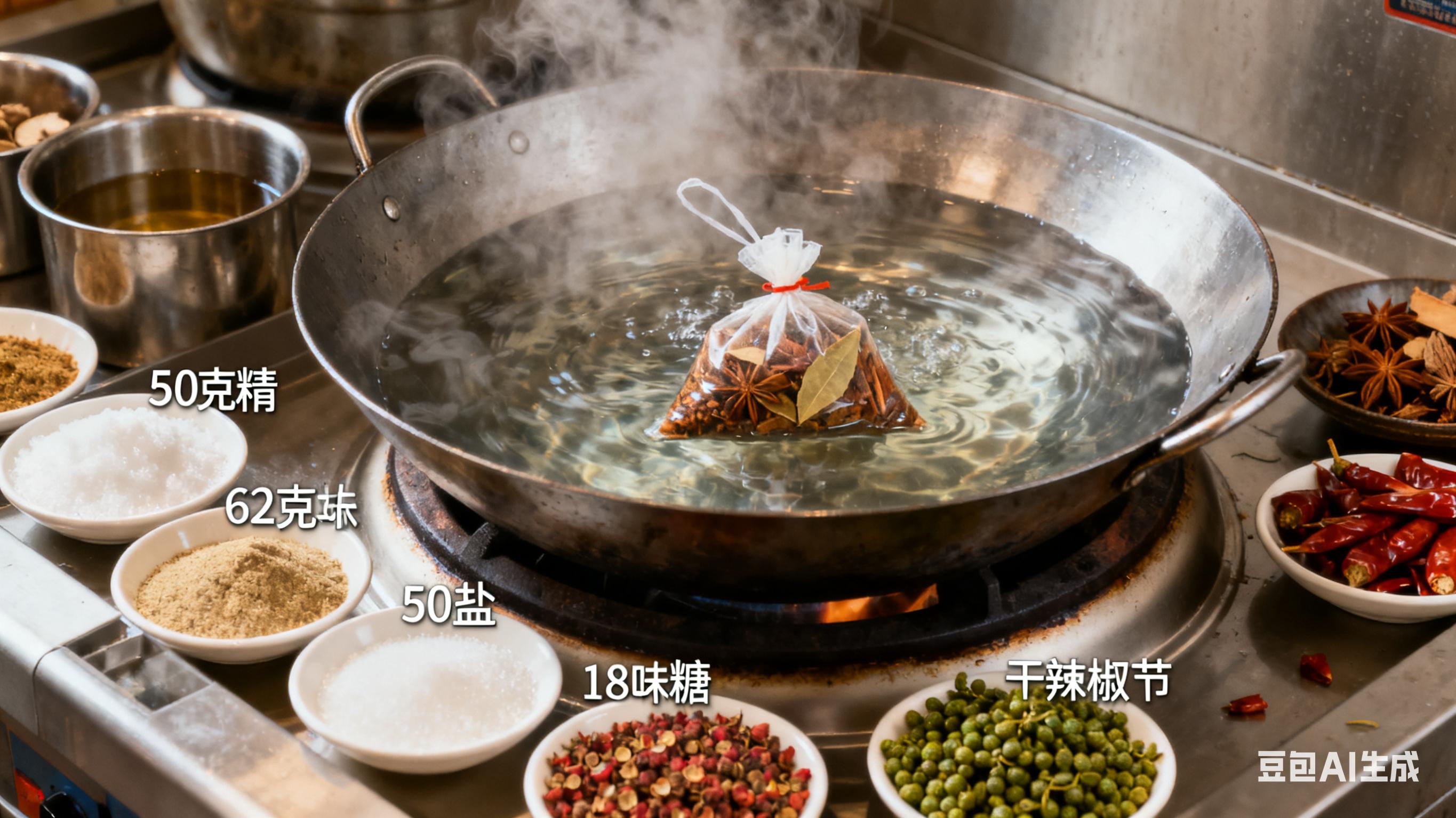 5斤清水加味精50克、盐62克、糖50克,放青花椒18克、红花椒6克、干辣椒节12克,加入香料包。大火煮开转小火慢熬30分钟。