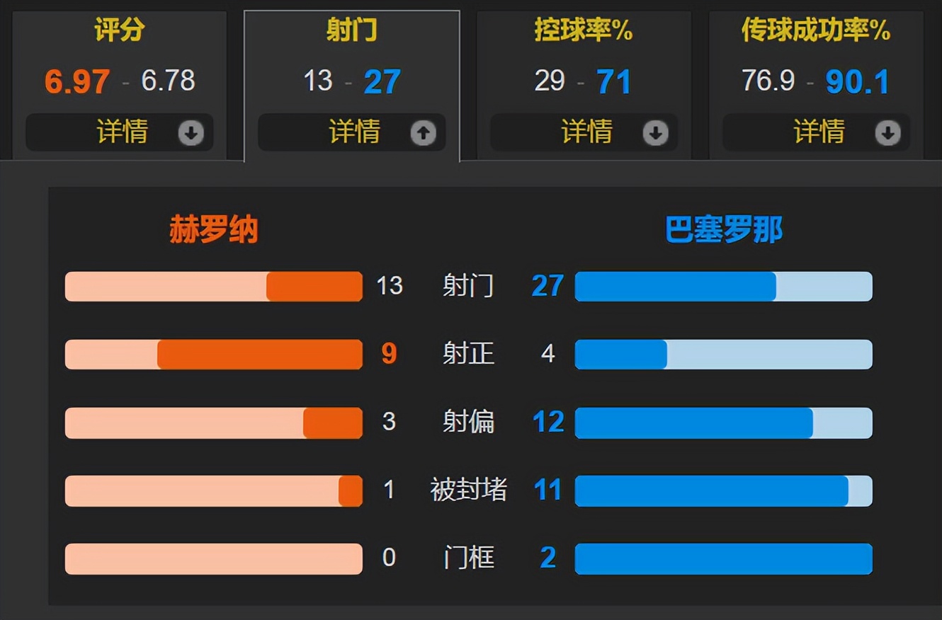 全场比赛,巴萨的控球率为71%,已经超过了七成,狂射27脚,其中仅有4次射正;赫罗纳一共有13次射门,其中9次射正,是巴萨的3倍,由此可见巴萨输球真不冤。亚马尔7射1正,费尔明5射0正,拉菲尼亚4射0正,费兰2射0正,巴萨一群攻击手在“盲狙”,都忘记带瞄准器。