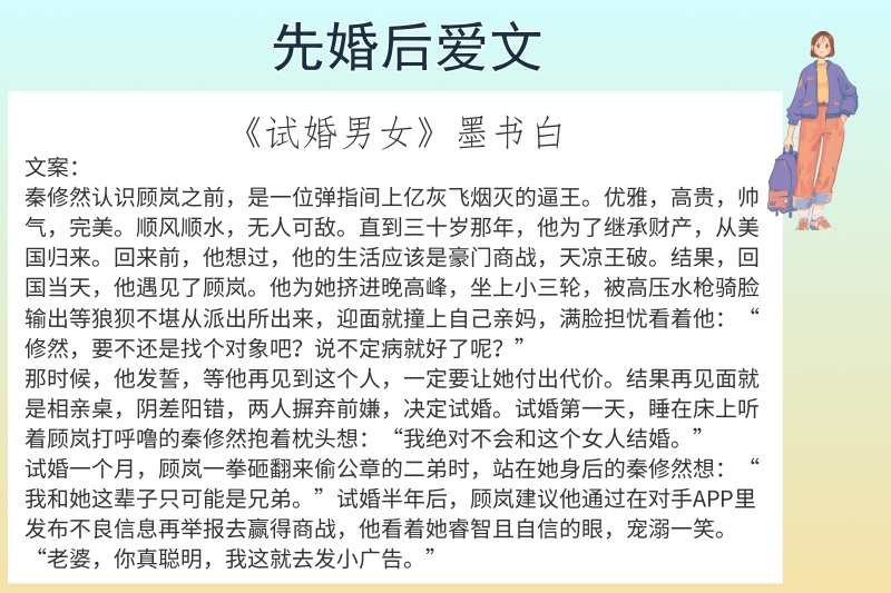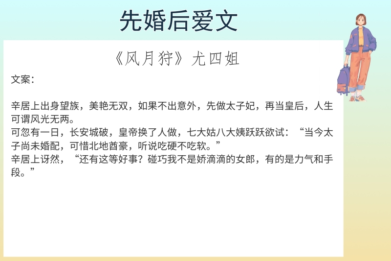 哈喽,大家好,这里是陌离小说!今天 给大家带来的是6本先婚后爱文,强推《风月狩》,女主差点做了前朝太子妃,在男主带兵攻入都城时,女主冒险挂灯,碰着男主,给男主留下深刻印象,又在机缘巧合之下相互了解,被封为太子妃后,和男主经历的一些波折。女主开朗胆大,男主粗中有细,两人的相处很有趣,推荐!