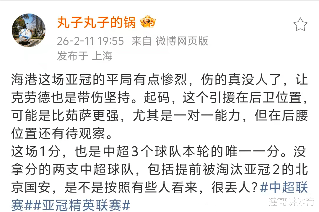 上海官方记者“丸子”称:上海海港这场亚冠平局拼的很惨烈,这场1分,也是中超3个球队在本轮的唯一一份,没拿分的中超球队,包括被提前淘汰的北京国安。顺带点评了一下疑似拉垮的北京国安队后,上海名记最近总结是:是不是按照有些人看来,很丢人?