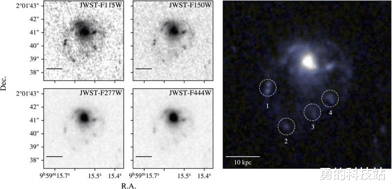 本工作中使用的四个JWST滤镜的缩略图COSMOS2020-635829。右侧的红绿蓝图像是JWST F444W(红色通道)、F277W(绿色通道)和F115W + F150W(蓝色通道)的组合。虚线圆圈标示了COSMOS2020-635829尾部识别的四个外层源。图片来源:《天体物理学杂志》