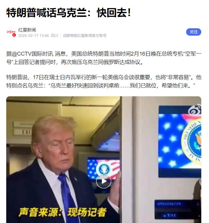 特朗普没藏着掖着,当着记者的面就说乌克兰必须赶紧回到谈判桌,别再硬扛了,还说2月17日在日内瓦的会谈简单得很,意思就是:乌克兰别挑三拣四,乖乖听美国的赶紧跟俄罗斯签协议。