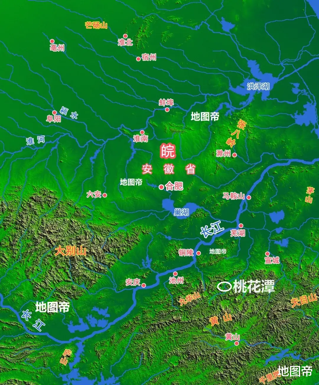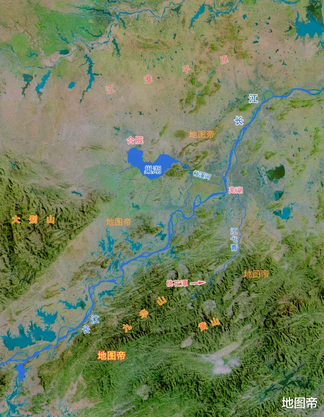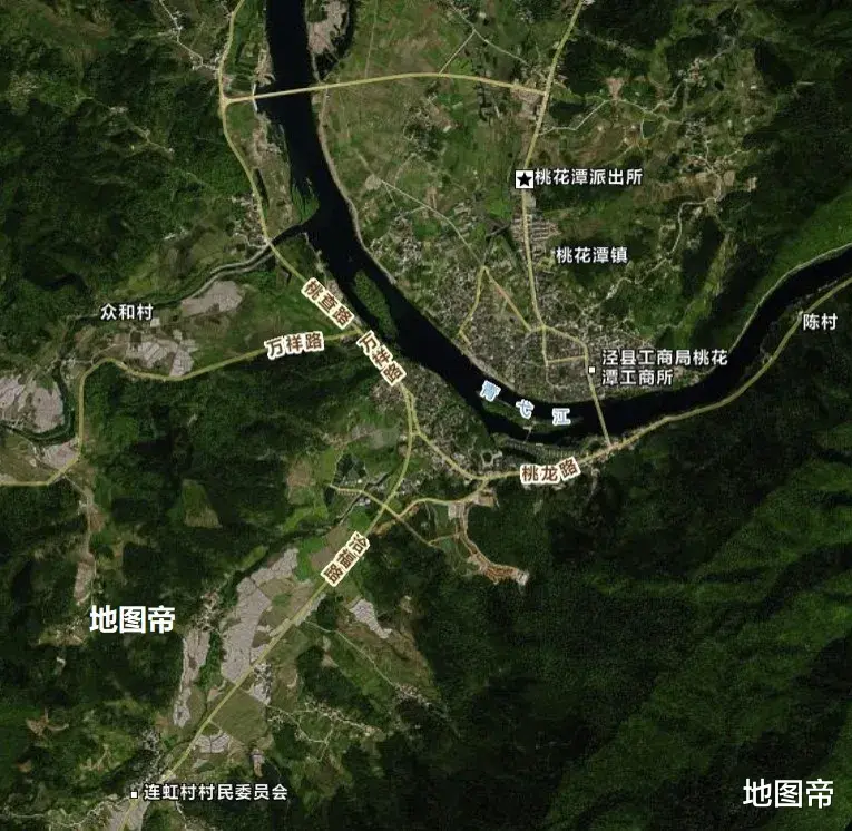桃花潭,长江支流青弋[yì]江上游的一段,位于安徽宣城泾县以西40千米桃花潭镇翟、万二村之间,南临黄山、西接九华山,与太平湖相连。青弋江这一段,十数里夹岸无杂树,而桃林缤纷,芳飞红雨,故称桃花潭。