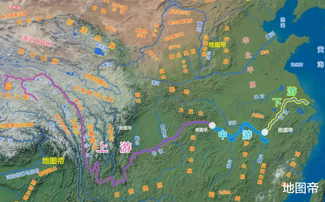 长江长约6397千米,居世界第三位,次于非洲的尼罗河和南美洲的亚马逊河。长江干流流经青海、西藏、四川、云南、重庆、湖北、湖南、江西、安徽、江苏、上海11个省、自治区、直辖市,于崇明岛以东注入东海。