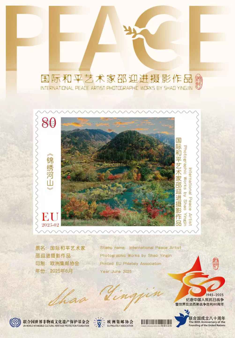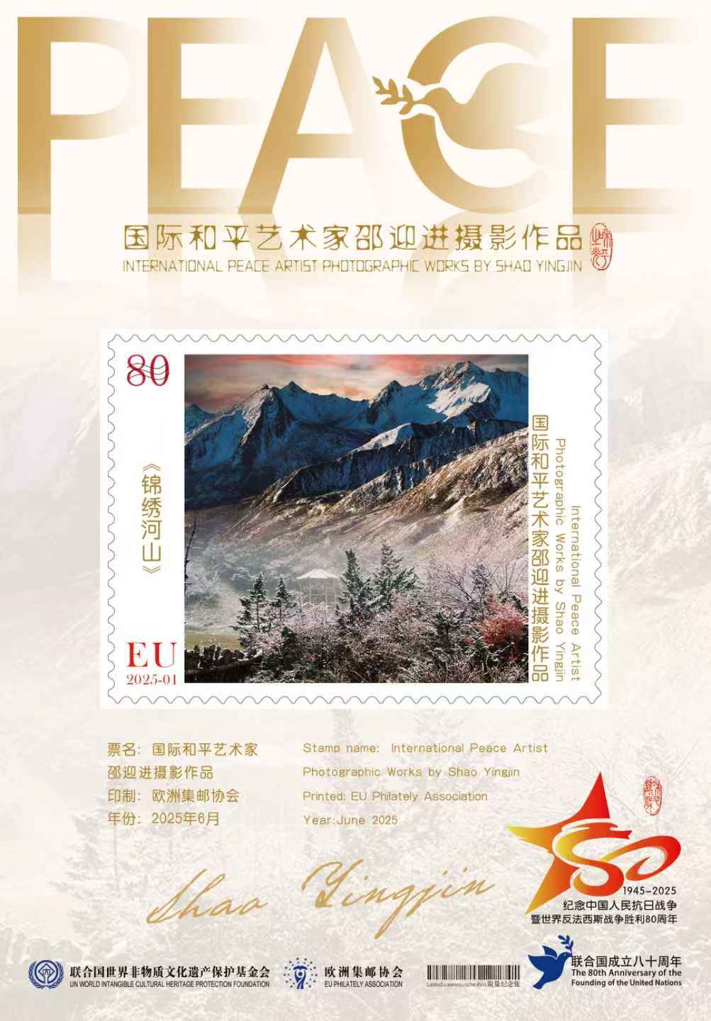 据悉,欧洲集邮协会联合联合国邮政及法国、德国、荷兰等多国邮政机构,精心策划并面向全球公开发行邵迎进主题邮票及相关珍藏册。这套邮品巧妙融合邵迎进的个人肖像与经典艺术作品,在方寸之间生动诠释了历史与艺术交融的独特韵味,成为传递和平心声、连接中外文化的重要载体。