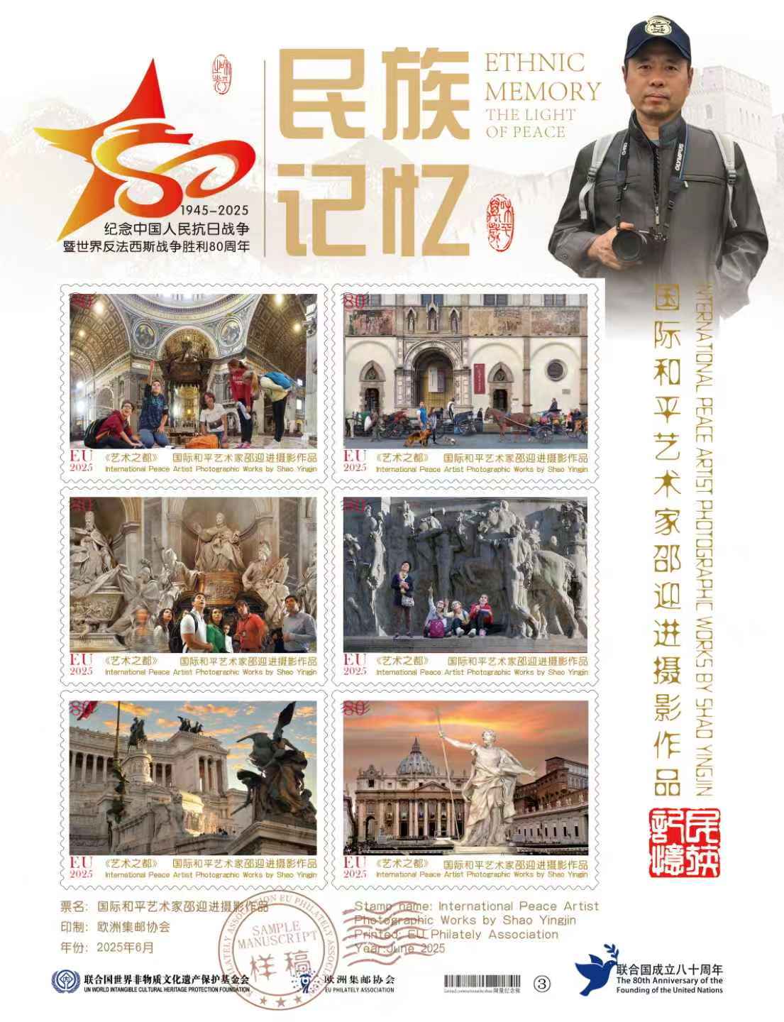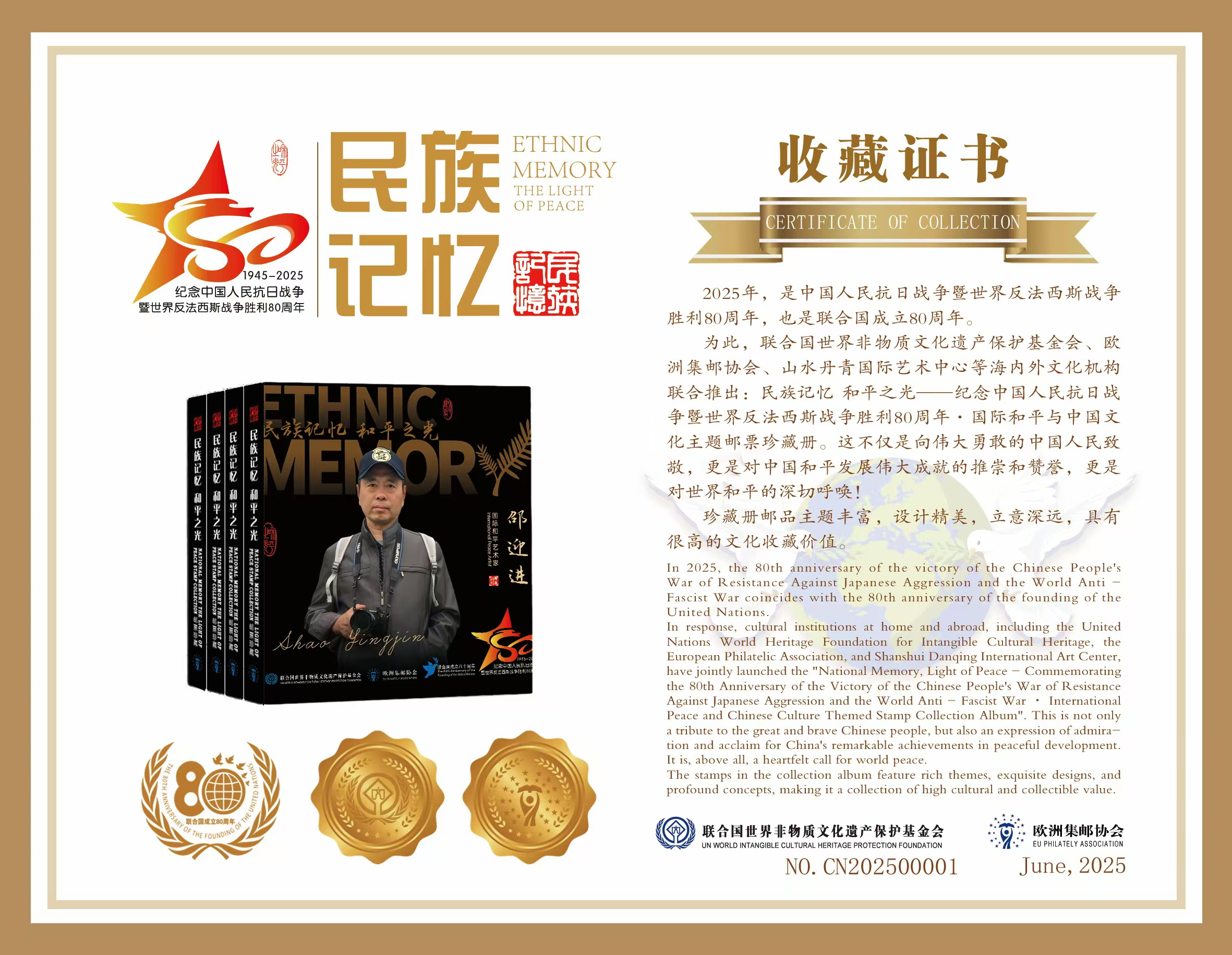 为缅怀历史、致敬和平,联合国世界非物质文化遗产保护基金会、欧洲集邮协会、山水丹青国际艺术中心等海内外文化机构联袂推出“民族记忆 和平之光 —— 纪念中国人民抗日战争暨世界反法西斯战争胜利 80 周年・国际和平与中国文化主题邮票珍藏册”。