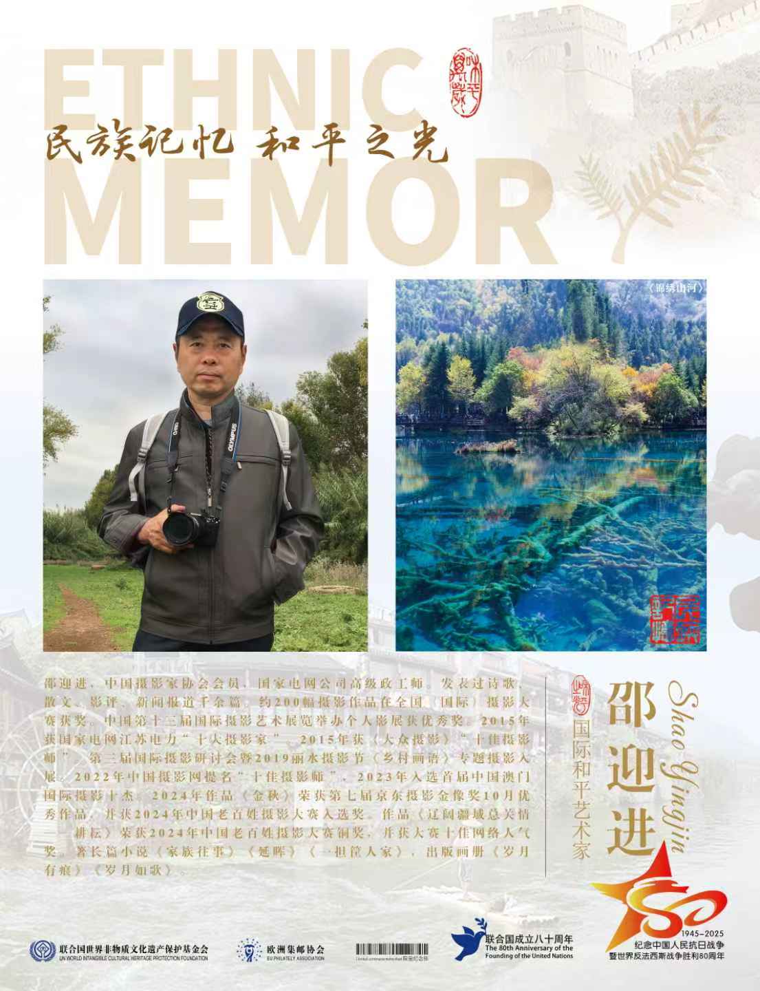 2025 年,是中国人民抗日战争暨世界反法西斯战争胜利 80 周年,亦是联合国成立 80 周年。在这一承载特殊历史意义的节点,联合国世界非物质文化遗产保护基金会鉴于邵迎进在摄影艺术与文学创作领域的卓越成就,特授予其“民族记忆和平之光 —— 国际和平艺术家”荣誉称号。