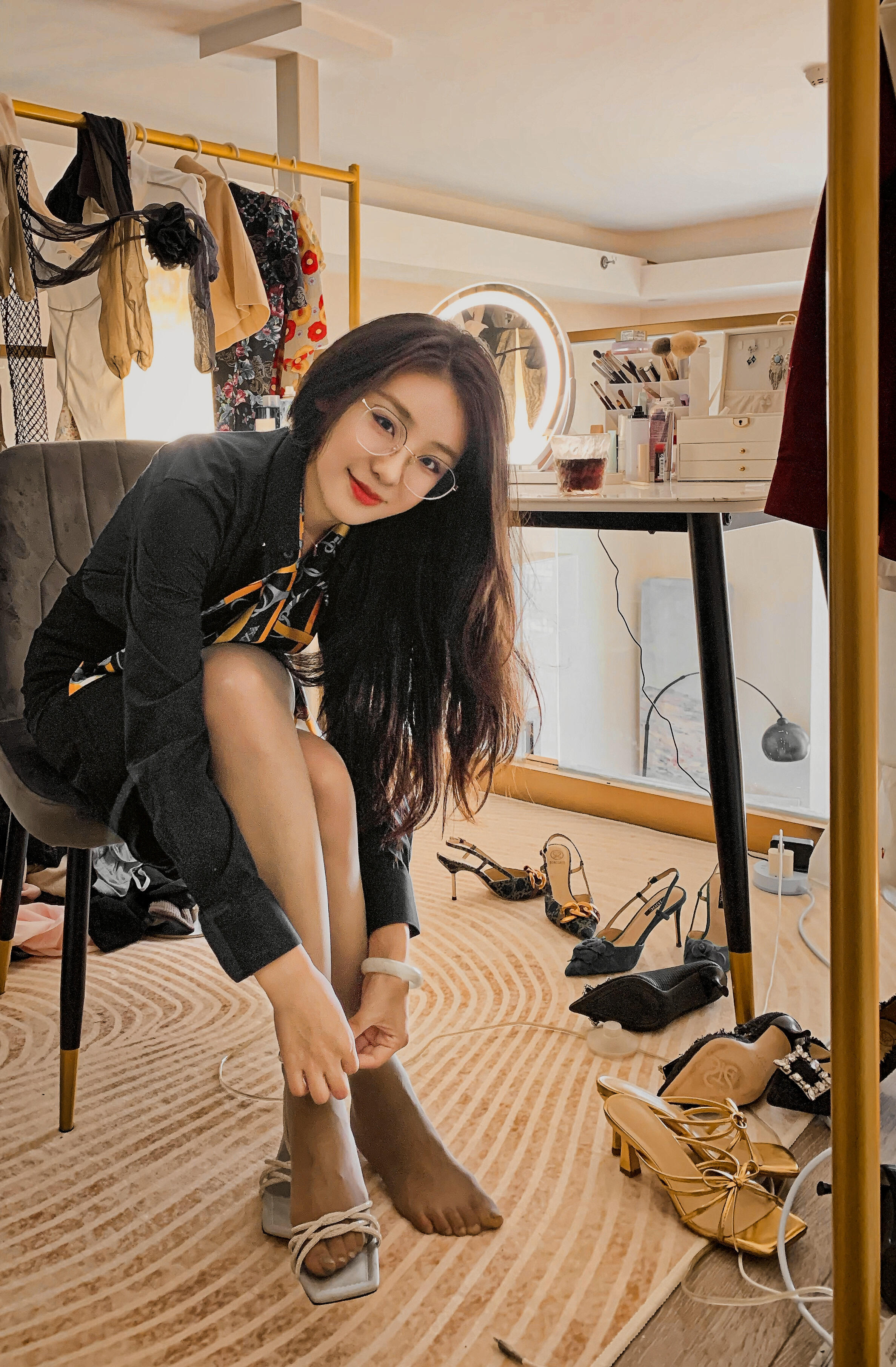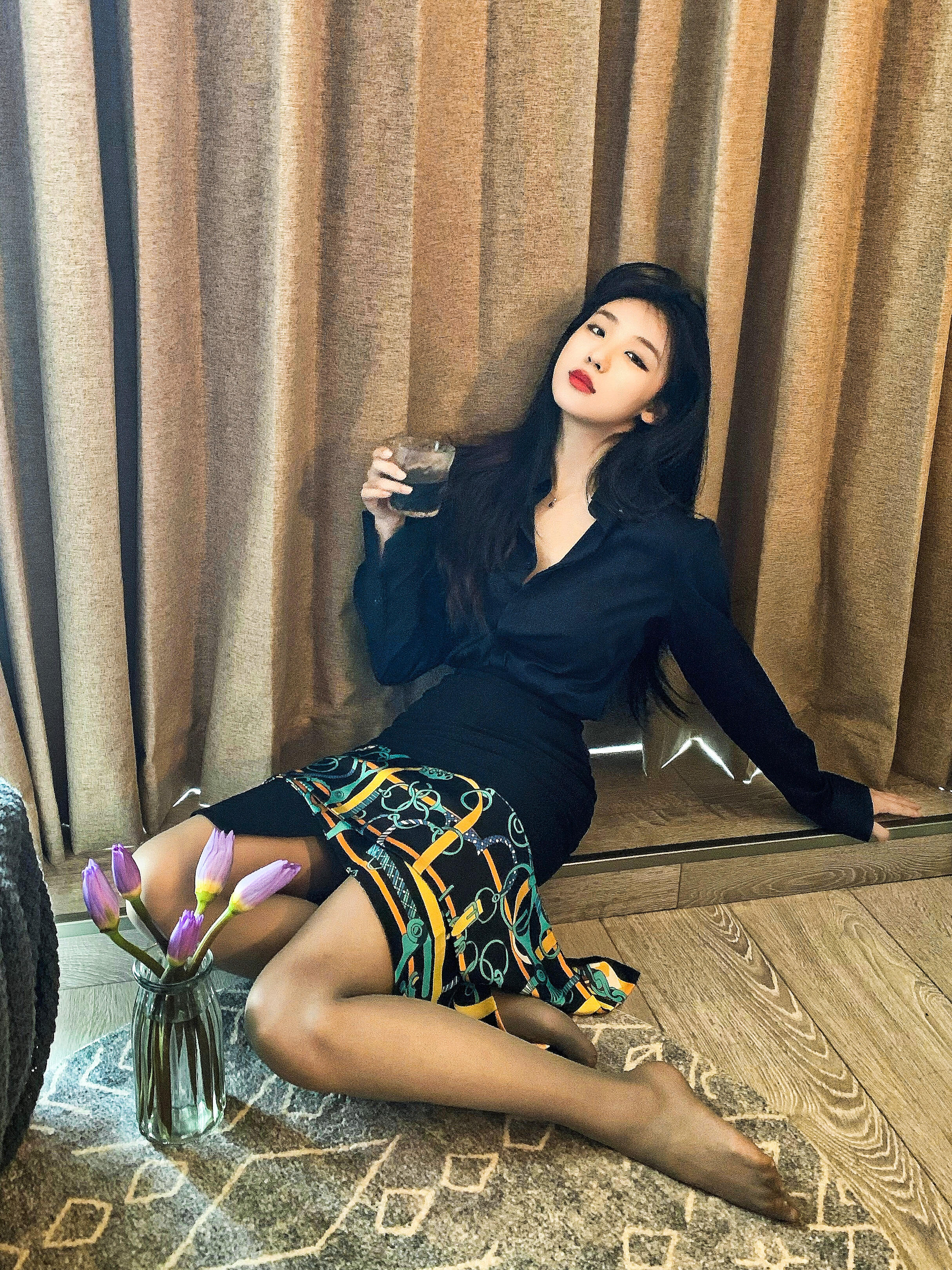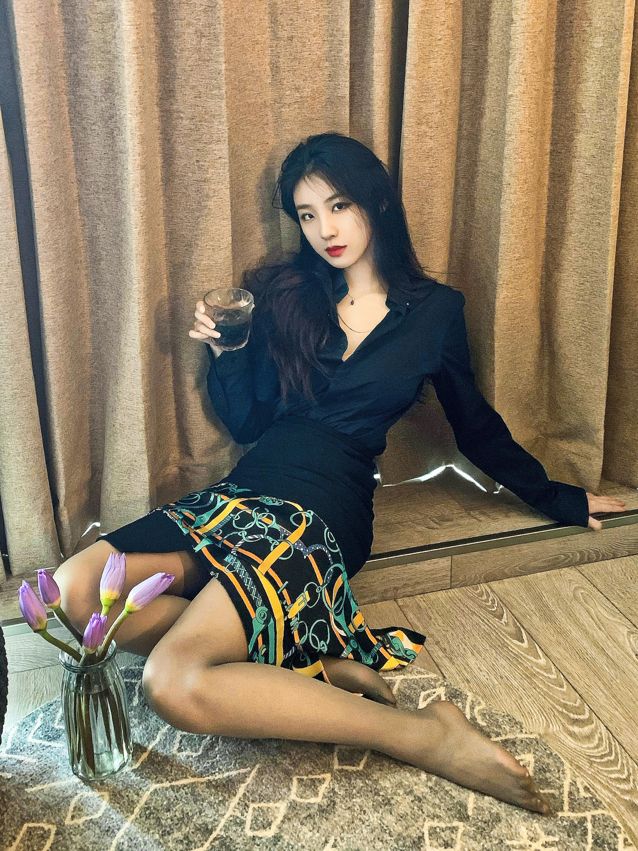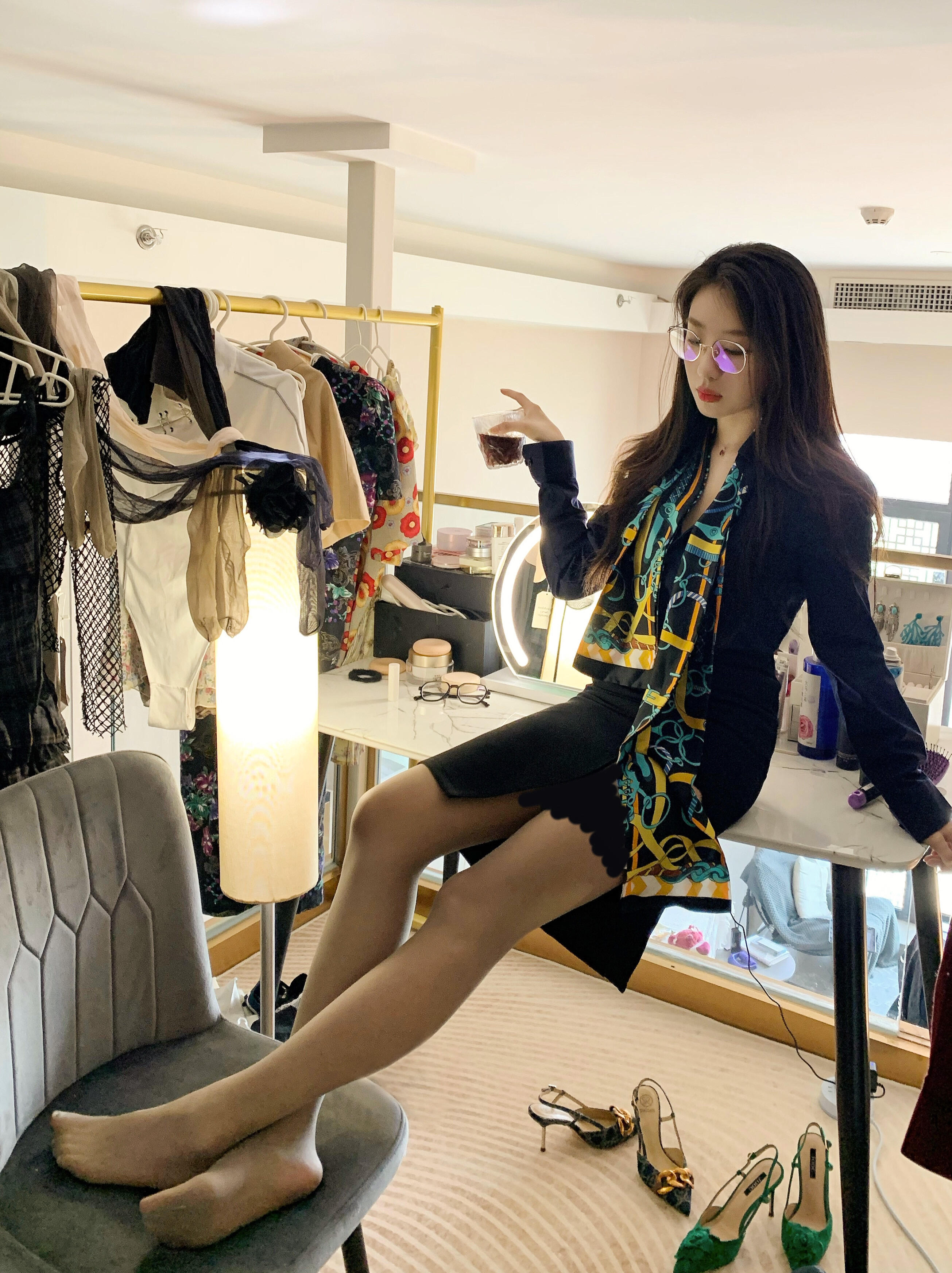 黑衬衫+开衩裙+丝袜,轻熟女的“氛围感杀器”来了