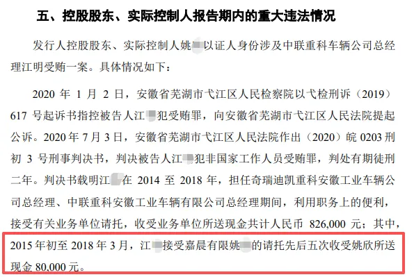 招股书显示,2015年初至2018年3月,姚某为帮助公司催收货款,先后五次向时任奇瑞迪凯、中联重科安徽工业车辆公司总经理江某赠送现金,累计8万元。经查,2014年至2018年,江某收受多家业务单位贿赂共计82.60万元,最终被安徽省芜湖市弋江区人民法院以非国家工作人员受贿罪,判处有期徒刑二年。