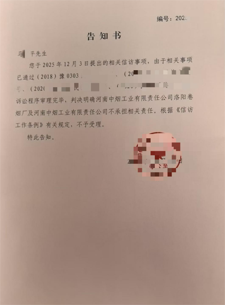 司法途径穷尽后,马某平寄望于信访救济,却遭遇闭门羹。2020 年后,他多次向河南烟草部门、洛阳某烟草单位信访相关窗口反映情况,请求核查企业资金往来、督促破产管理人履职,并妥善解决债权人损失。但该窗口未作任何调查核实,便以 “司法程序已终结” 为由不予受理,既未核查洛阳某烟草单位疑似抽逃出资的相关情况,也未按规定将涉相关违规线索移交对应监管部门,彻底切断了他最后的维权路径。