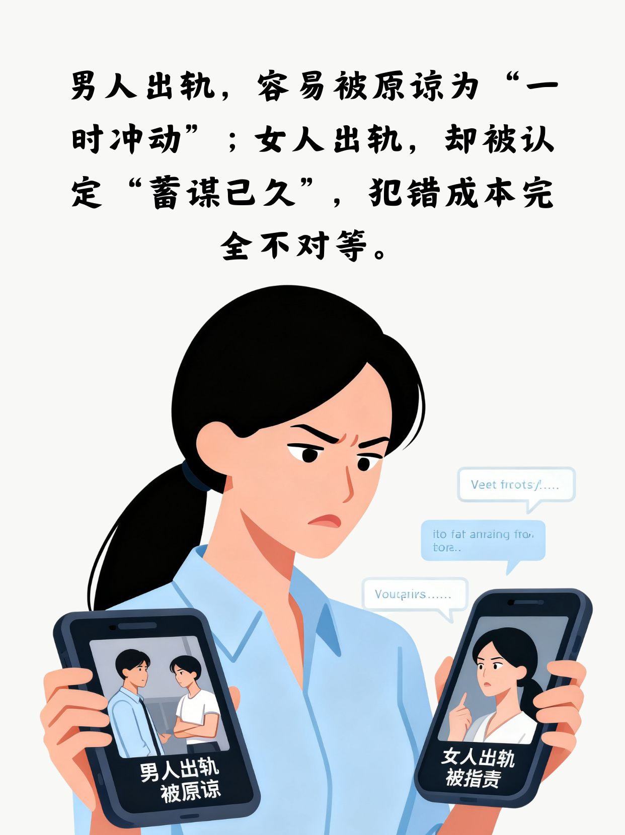 同样是出轨,男女却面临截然不同的结局,本质是性别偏见与双重标准在作祟。感情的忠诚本该是双向奔赴,而非用不同标尺衡量。愿每段关系都能摒弃双标,用平等与尊重守护初心。