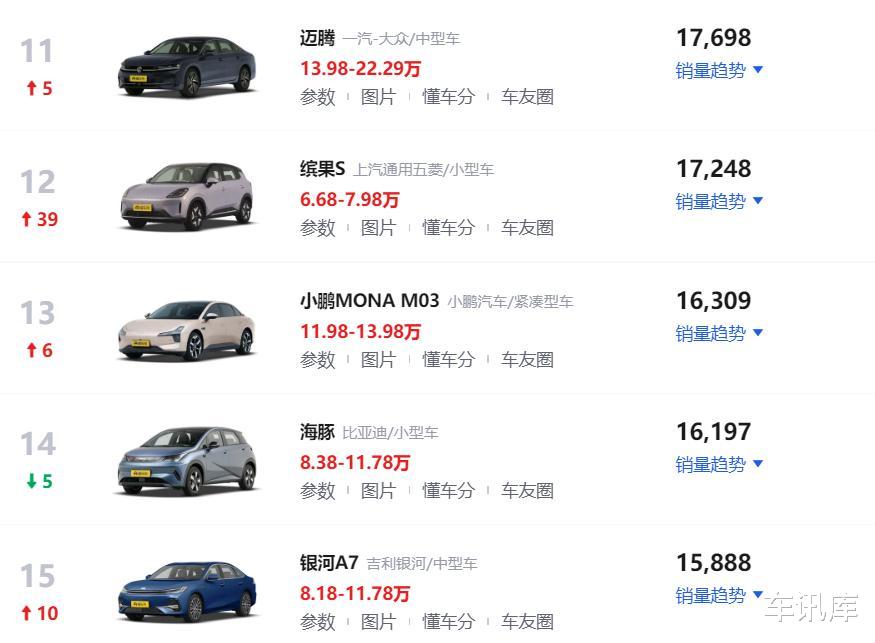 月度销量排行榜11至15名的家用轿车,销量排名变化就要大的多,相互之间的竞争也更加激烈。大众迈腾的月销量达到17698辆,不仅跟帕萨特的差距越来越小,销量排名也是提升至第十一名。五菱缤果S和吉利银河A7这两款新车型,10月份的销量成绩也都很不错,真正做到上市即热销。小鹏MONA M03的月销量也是成功突破1.6万辆大关,排名提升至第十三名。凭借高性价比的市场定位,再加上不俗的综合表现,MONA M03已经成为小鹏的绝对销量主力。比亚迪海豚的销量排名有小幅度下滑,不知道是不是跟新款比亚迪海豚测试的消息曝光后,使得许多意向客户开始观望。
