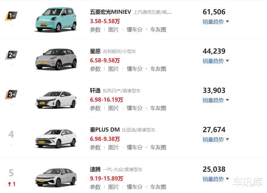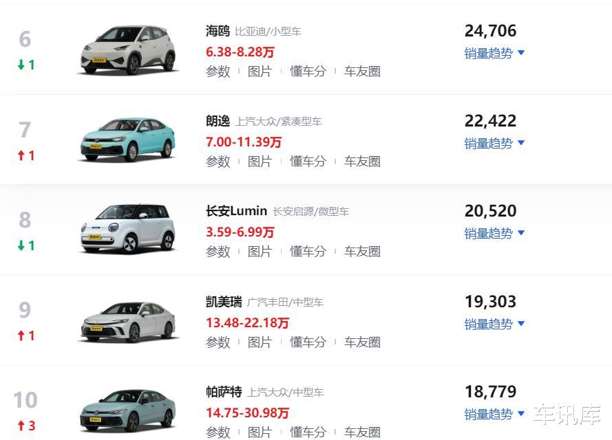 我们再来看看排行榜6至10名的车型,整体的销量排名变化也不是特别大,销量成绩也都比较不错。比亚迪海鸥和长安Lumin的销量也是均突破2万辆大关,排名也都非常靠前,看来新能源入门级轿车,是真的深受消费者喜爱。大众朗逸的销量排名有小幅度提升,位居排行榜第七名。该车如今的优惠力度是相当大,已经成为上汽大众事实上的入门级轿车。丰田凯美瑞和大众帕萨特这两款经典燃油中型轿车,分别位居排行榜第九名和第十名,成为排行榜前十仅有的2款中型轿车。就是不知道按照目前这个发展趋势,它们还能不能始终稳居中型轿车的销量前列。