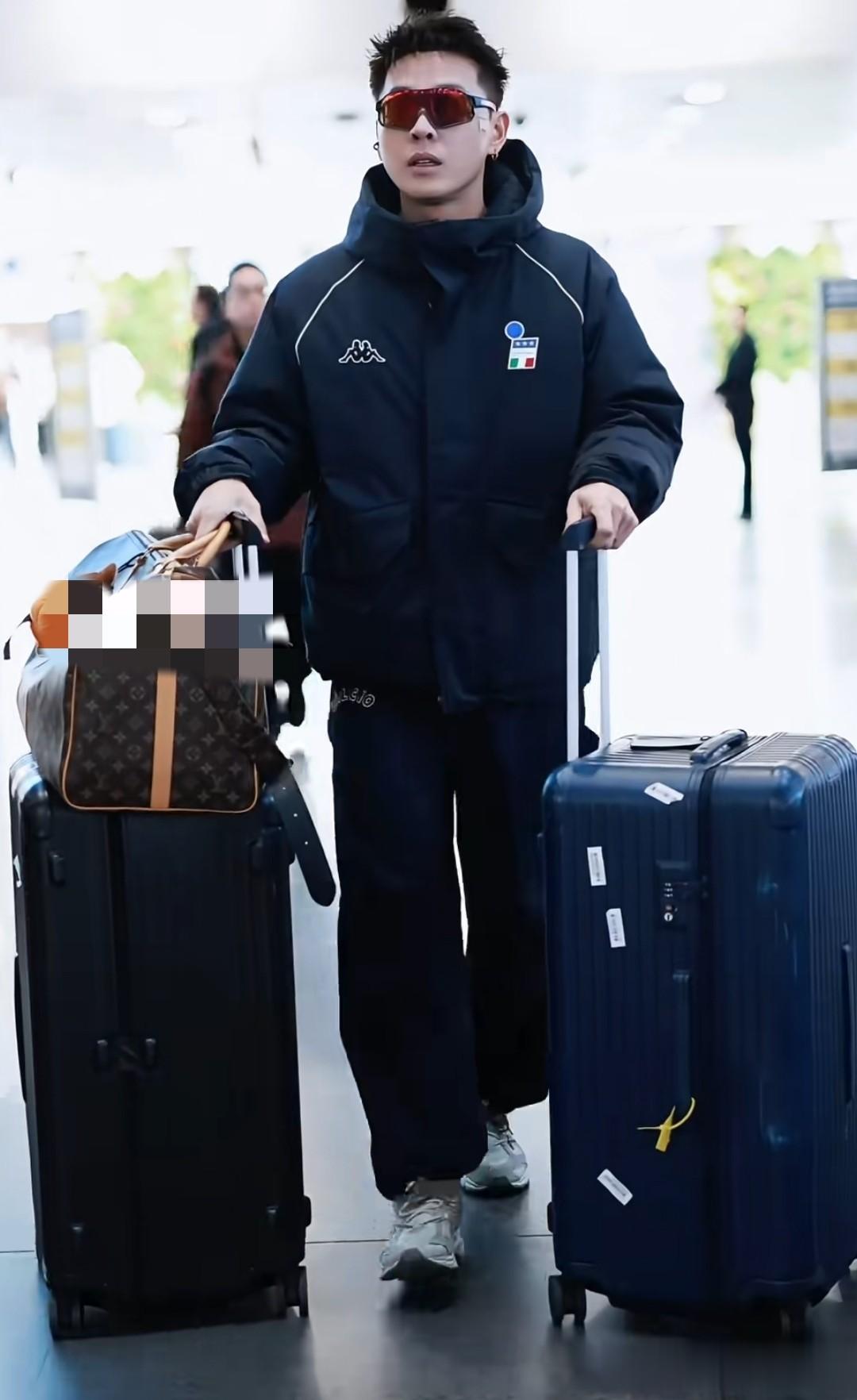 洪尧则是穿着一套夹棉运动装,戴着一个红色的墨镜,酷劲十足。大件的两个行李箱都由他拿着,这一点即便是一个大男人该做的,也还是挺拉好感的。