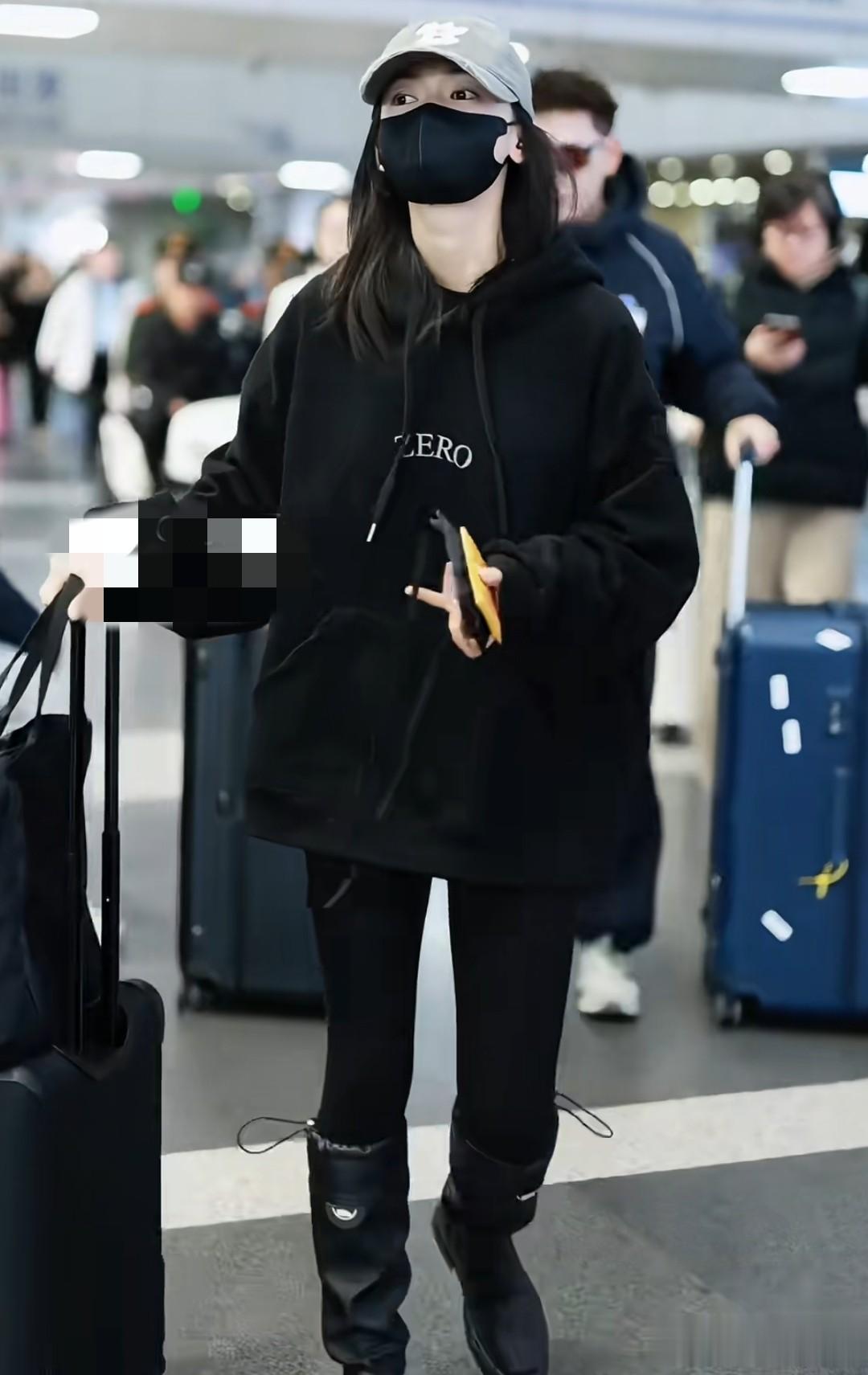 吴谨言戴着鸭舌帽和口罩,穿着一件黑色长款连帽卫衣,下身一条打底裤配长筒靴子,休闲又不失时尚。