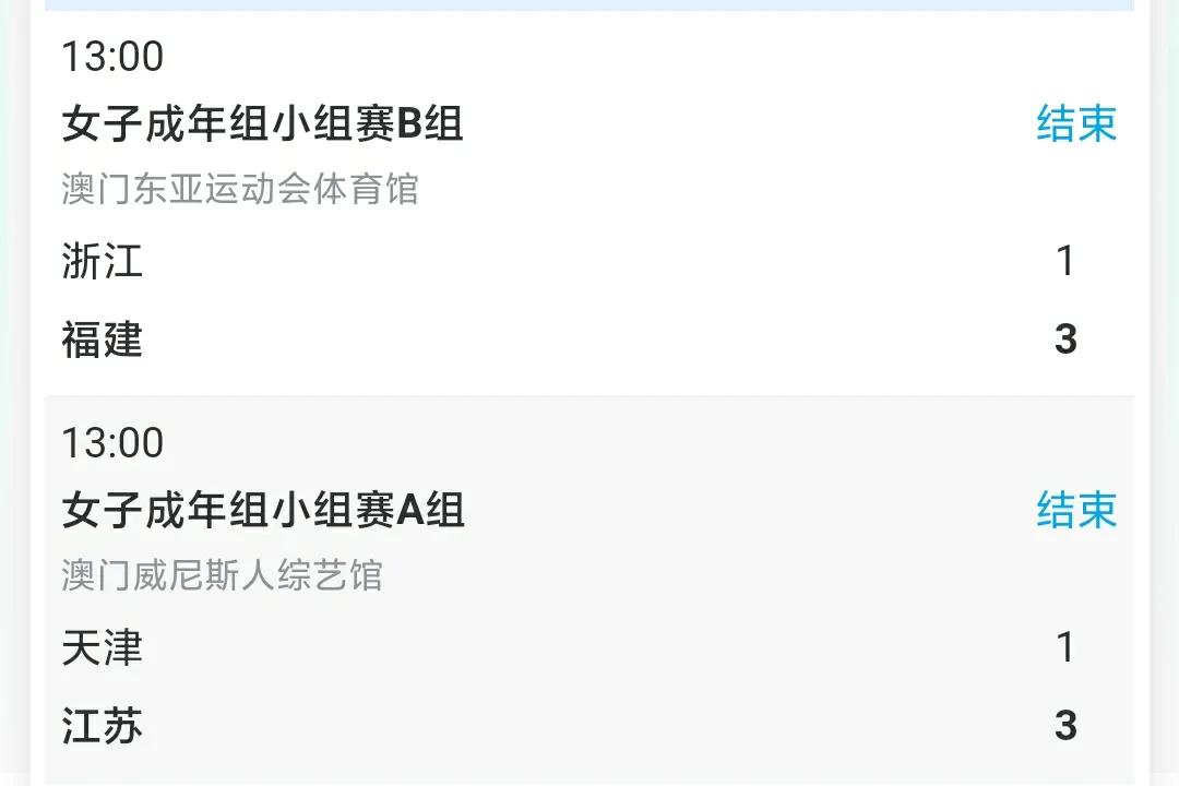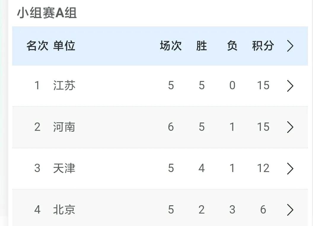 这样A组第一名是江苏女排,B组的第一名本来以为是福建女排,由于福建女排丢了一局比赛,现在山东女排又回到了第一名的位置。