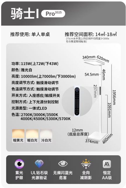 安全性上,柏曼骑士IPro也是行业顶尖,蓝光危害等级RG0,还有钻石光源认证,PWM调光技术让频闪危害无处遁形,UGR小于10,再加上TÜV国际认证,12年都能保持教室级照明品质,它解决了光衰难题。