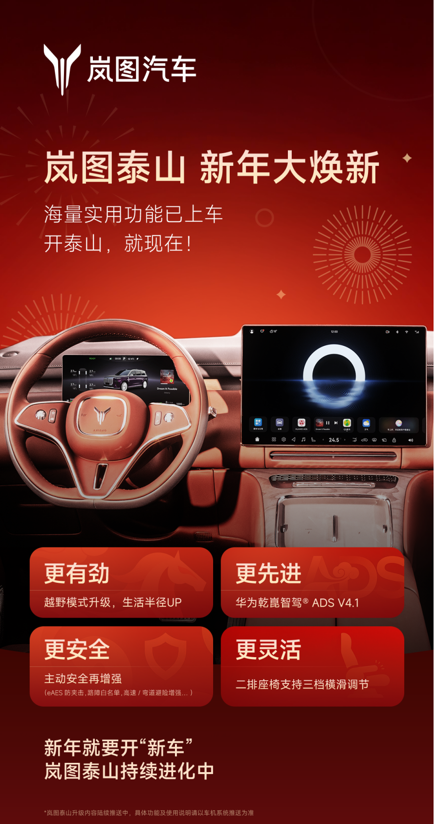 2026年2月4日,岚图汽车向岚图泰山车主正式推送首次重大OTA升级!此次升级以华为乾崑智驾ADS 4.1为核心,覆盖智能座舱、辅助驾驶、越野性能三大维度,用“商务+越野”双场景差异化优势。