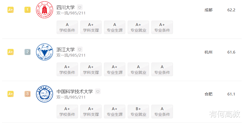 四川大学不仅是国内该领域的“老大哥”,更是川大实力超群的王牌专业。根据2025软科中国大学专业排名来看,四川大学的高分子材料与工程专业在上榜的102所高校当中获评A+,位列全国第1,力压浙江大学和清华大学。