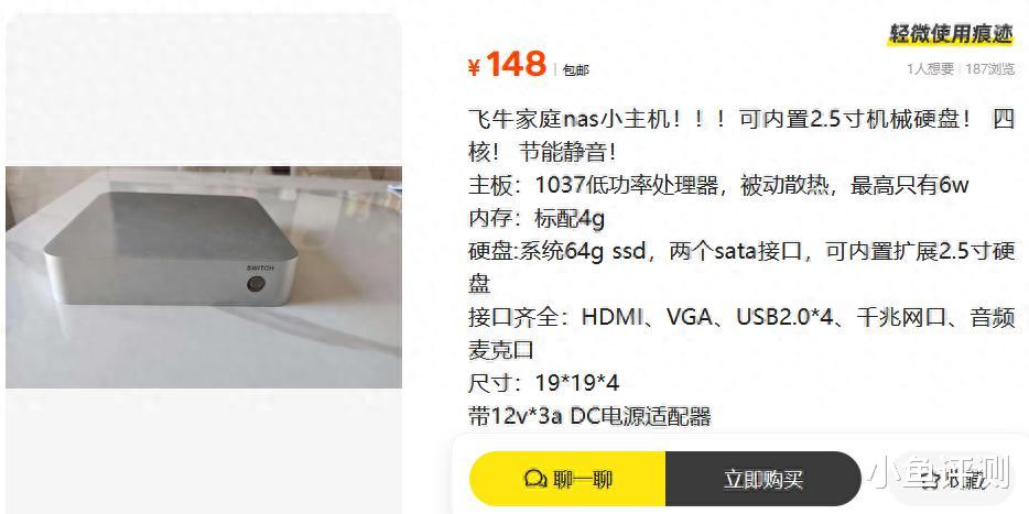 重点是什么?是148元。这个价格放在今天,连个像样的路由器都买不到。隔壁某品牌新出的入门NAS单机身就敢标699,还得另配硬盘。这边直接整机带电源,系统刷好,插网线就能用。放在三年前,这种配置至少得三百往上,现在直接腰斩两次,跌至冰点。