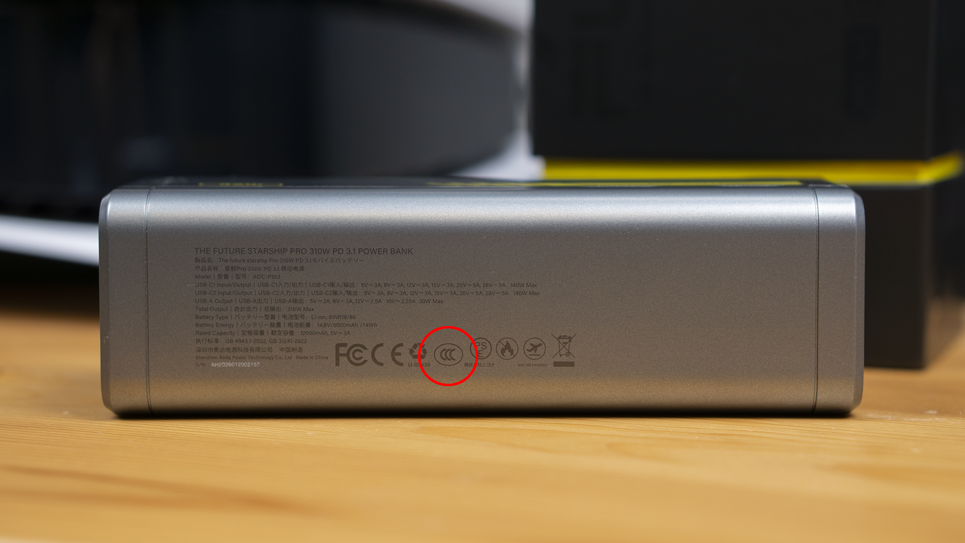 背面有其端口的输入输出信息。它有着CCC的标准,容量符合民航要求,可以带上飞机。