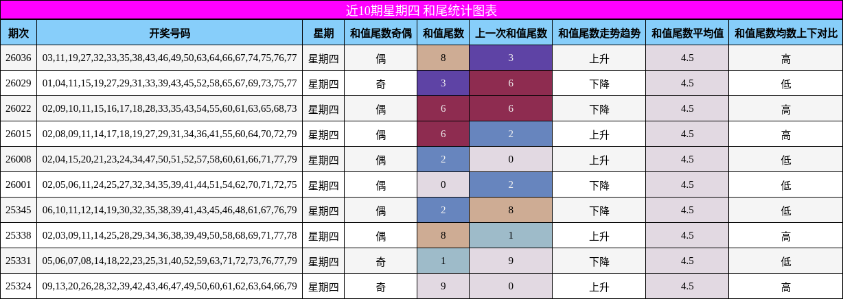 和尾走势:偶数尾数回归,关注0点位近10期星期四和值尾数走势呈现波动特征,升平降交替出现,整体均值为4.5,上下各占5次,显示走势相对平稳。但值得注意的是,上期和值尾数相较前一期持平,而近10期中,和值尾数上升5.0点,表明整体趋势有上行压力。