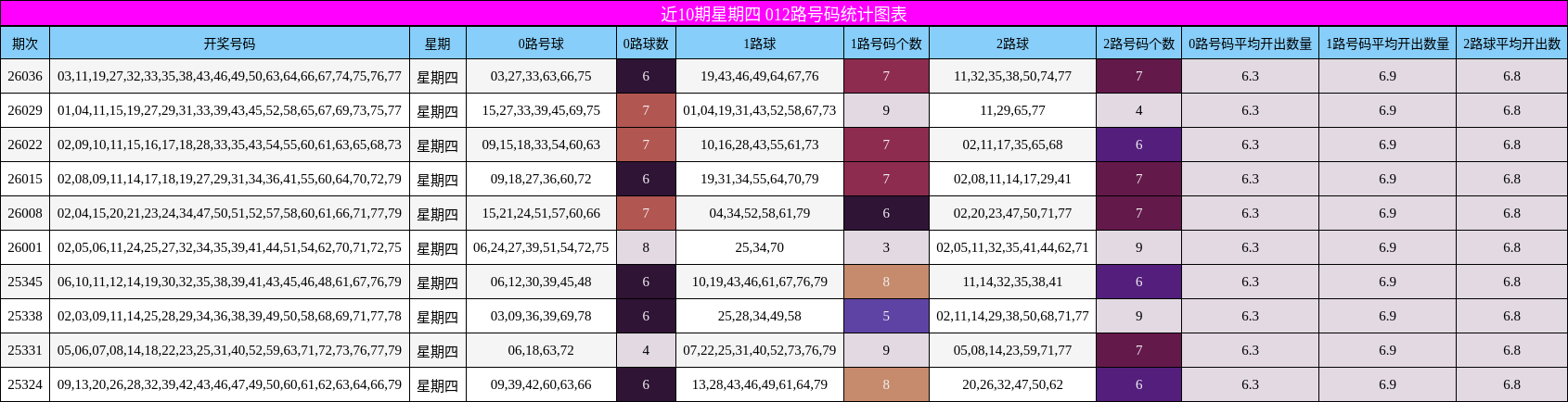 012路分析:0路与1路双热,2路持续发力从近10期星期四的012路分布来看,0路号码平均每期开出6.3个,1路6.9个,2路6.8个,三者差距极小,整体趋于均衡。但值得注意的是,上期2路号码开出10个,远超平均值,显示2路在近期有明显发力迹象。