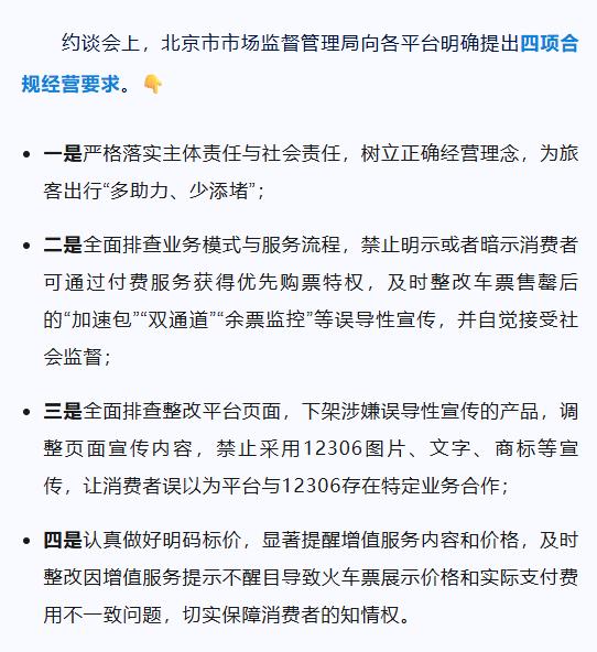近日,北京市市场监督管理局组织携程、去哪儿、飞猪、同程、美团、京东、航旅纵横、高铁管家、滴滴、高德地图、百度地图、腾讯地图等 12家涉及火车票网络销售业务的主流平台 ,重点围绕群众反映强烈的网络销售火车票突出问题召开行政约谈会。