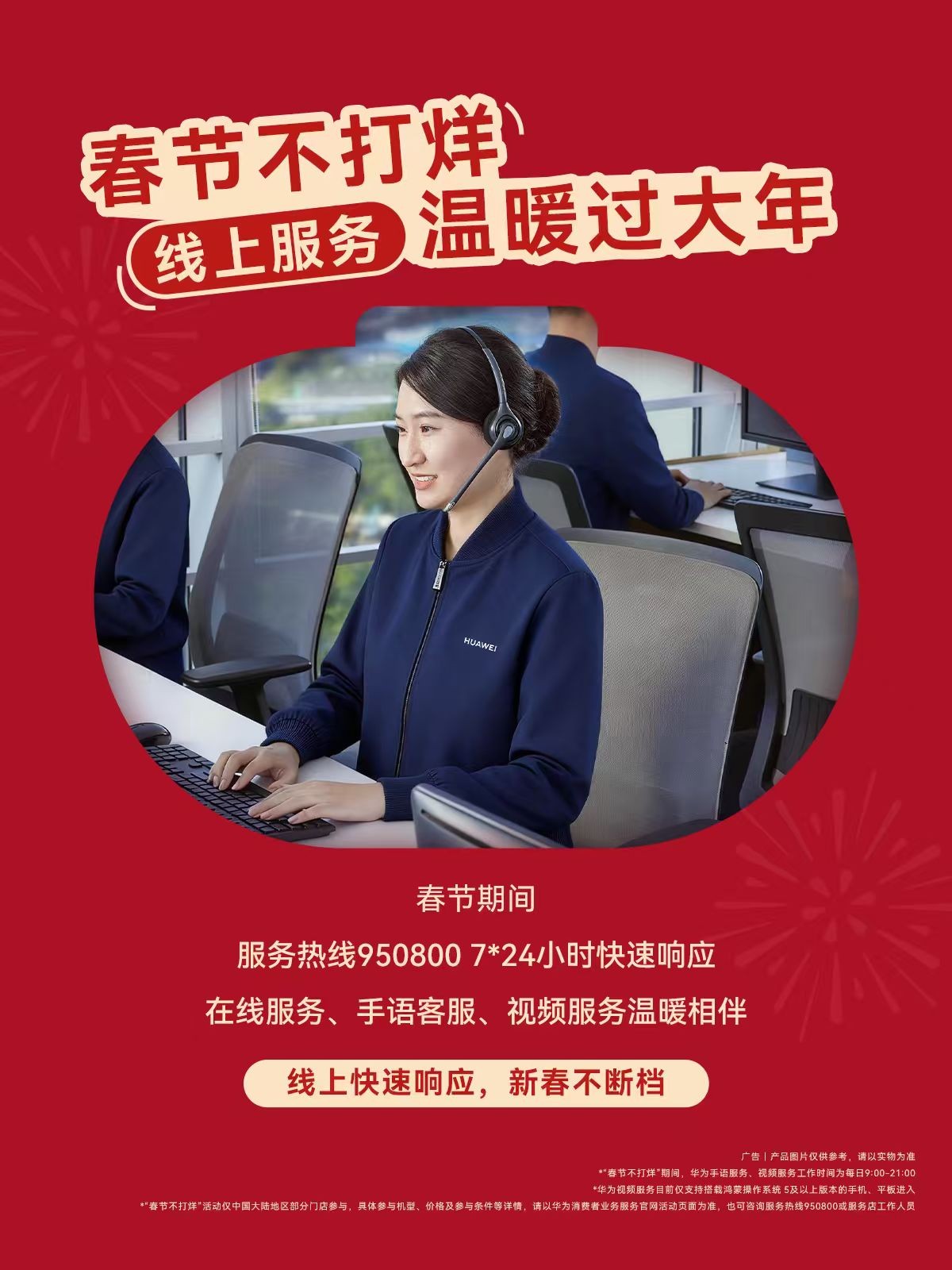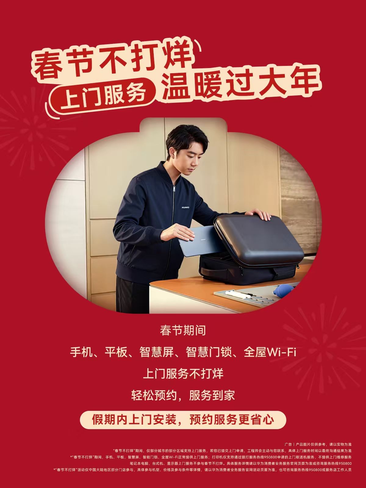 科技的终极意义是服务于人。华为用“春节不打烊”活动证明:硬核技术之外,更有温暖陪伴。春节将至,如果你有任何设备维护、安装或咨询需求,可通过我的华为APP、华为消费者业务服务官网、华为消费者服务热线等渠道查询活动详情,让团圆时刻安心无忧。