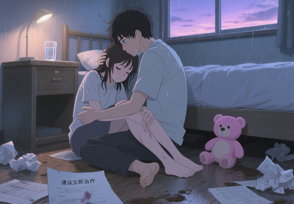 那个漫长而混乱的下午,我们像两个在暴风雨中失散太久、终于找到彼此的溺水者,紧紧相拥在冰冷的地板上。所有的语言都显得苍白无力,只剩下泪水是真实的,是滚烫的,是冲刷着六年积郁的唯一出口。窗外,雨势渐歇,暮色四合,房间里没有开灯,一片昏暗。苏晴的哭声渐渐低了下去,变成了断断续续的抽噎,身体因为长时间的哭泣和紧绷而微微颤抖。我小心翼翼地扶着她,让她靠在我怀里,笨拙地用衣袖擦拭她脸上纵横交错的泪痕,动作轻得像触碰易碎的瓷器。她闭着眼,长长的睫毛湿漉漉地黏在一起,疲惫得像是耗尽了所有力气。沉默在昏暗里蔓延,却不再冰冷,而是带着一种劫后余生的、沉重的平静。过了许久,久到我以为她睡着了,她才极其微弱地、带着浓重的鼻音开口,声音嘶哑得像砂纸摩擦:“……后来……安安走了……我……我也就不想治了……” 这句话轻飘飘的,却像一块巨石砸进我好不容易平复些许的心湖,激起滔天巨浪。我浑身一僵,搂着她的手臂下意识地收紧,心被巨大的恐惧狠狠攫住。不想治了?她竟然……在女儿离开后,选择了彻底放弃自己?!