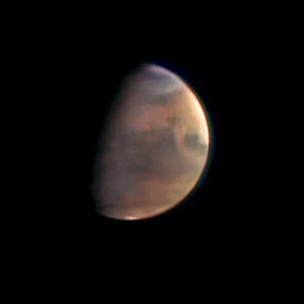 尽管如此,仍有足够多的图片让主持人在一小时的直播过程中感到高兴。最初的视图显示了大约三分之一的火星,随着航天器绕火星飞行,这些火星影像在框架中逐渐变大,然后再次缩小。在一些照片中可以清楚地看到火星上空的白云。