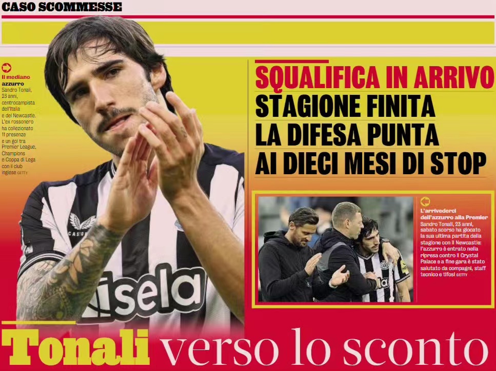 《米兰体育报》上周发布了一则令人震惊的消息,托纳利赌球案的认罪细节引起了广泛关注。据记者Valerio Piccioni的详细报道,托纳利可能面临长达10个月的禁赛,不仅报销本赛季,还将错过明年夏天的欧洲杯。