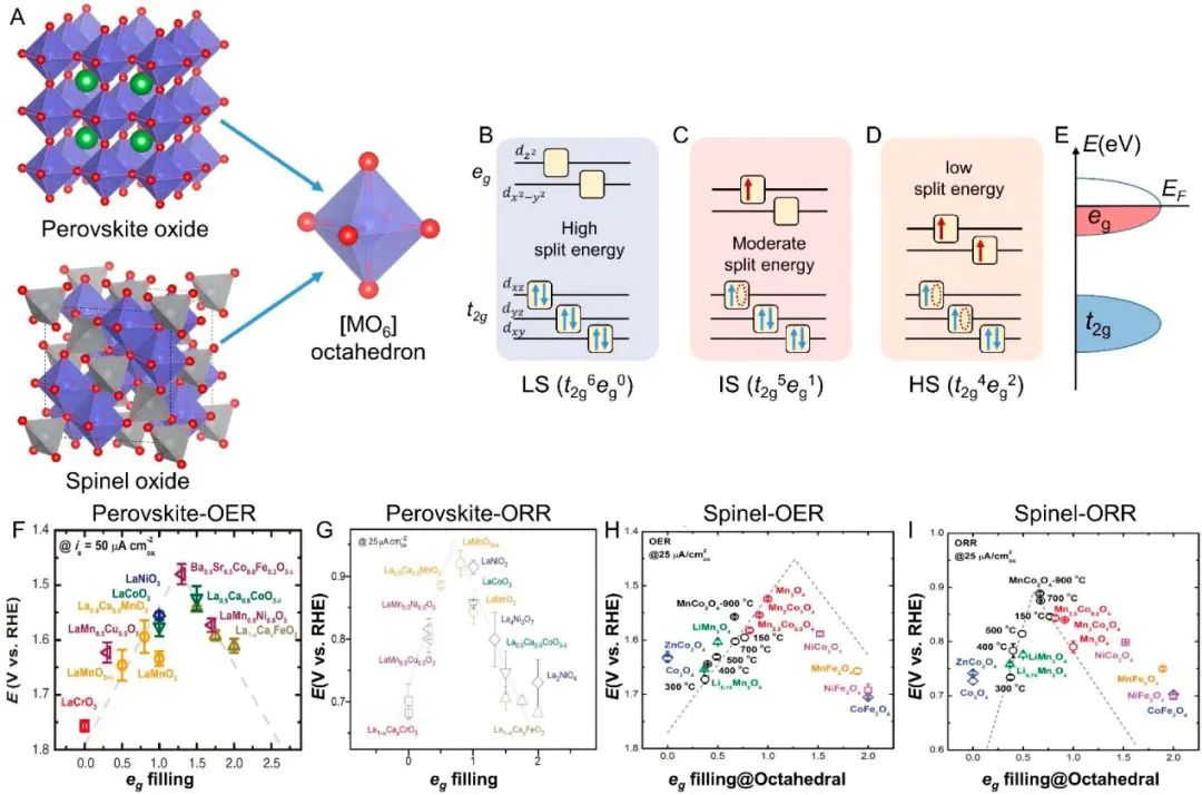 在电催化材料(如过渡金属氧化物和含过渡金属的复合物)中,eg和t2g轨道占据情况被证明是影响催化活性的重要电子结构指标。八面体配位的过渡金属氧化物中,表面过渡金属的eg轨道电子占据数与催化活性呈火山曲线关系。