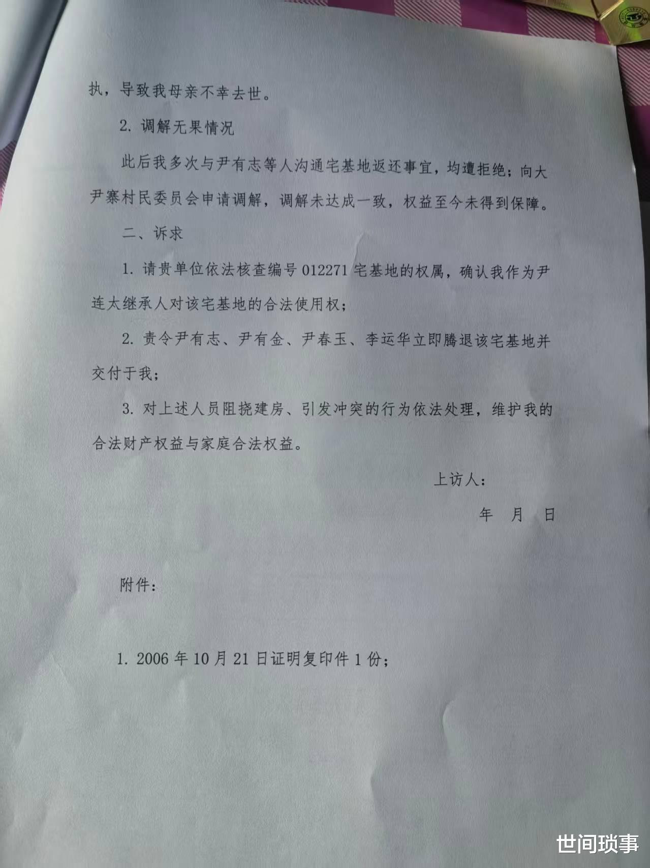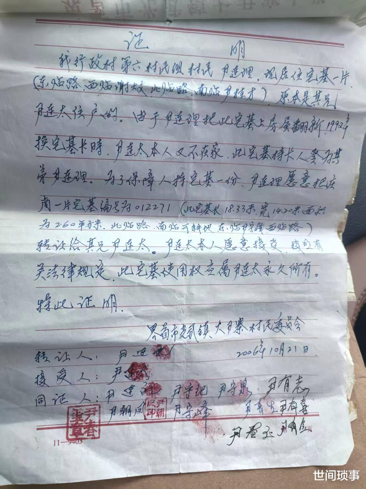 2006年,面对过户问题久拖不决,双方在大尹寨村民委员会主持下达成书面调解协议。10月21日,村委会出具《证明》,确认:"尹连理自愿将编号012271的宅基地转让给其兄尹连太""此宅基使用权应属尹连太永久所有"。该协议有尹连理、尹连太及尹守记、尹守泉、尹有志、尹朝凤、尹守峰、尹春生、尹有喜、尹春玉、尹有金等多名亲属签字捺印,并加盖村委会公章。