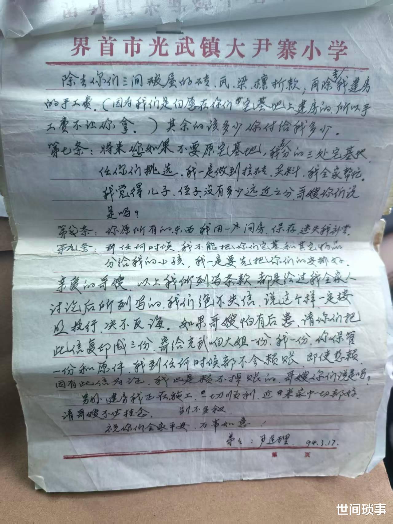 这些承诺构建了一个看似完善的保障体系:既有对原宅基地权属的确认,又有替代方案的提供;既有对晚辈的约束,又有对违约后果的预判。尹连理甚至特意叮嘱:"如果哥嫂怕有后患,请你们把此信复印成三份,寄给光武咱大姐一份,我一份,你保管一份和原件。"