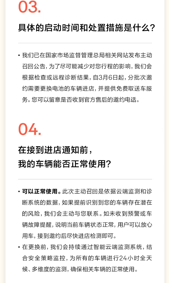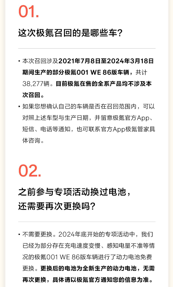 ①此次召回涉及2021.7-2024.3 生产的部分001 WE86 版车型,在售车型不受影响。