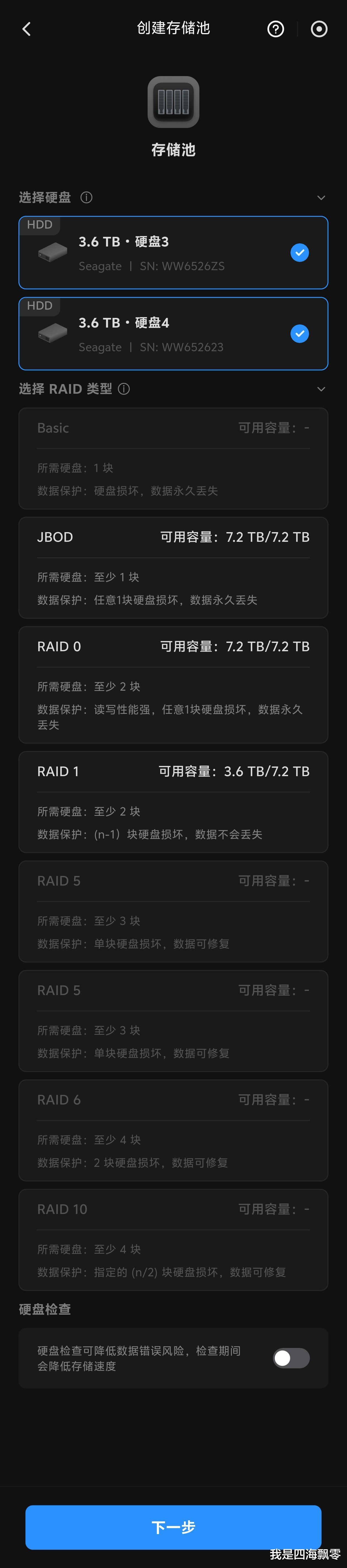 绿联DH4300 Plus允许用户根据需求搭建多种RAID模式以构建存储池。由于四海哥我的手上只有两块4TB硬盘,因此就选择了RAID 1模式,并搭配Btrfs文件系统使用,后者具备支持文件夹快照的功能。