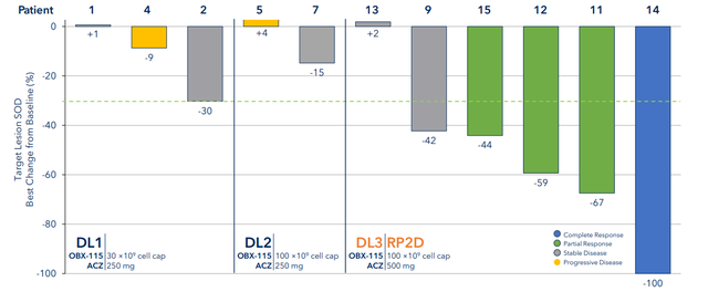 一名67岁的晚期黑色素瘤患者,在接OBX-115治疗48天后,肿瘤显著缩小,实现病情稳定(SD)。