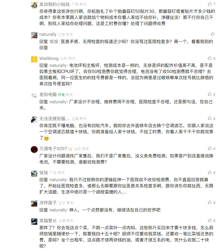 老铁一方面跟我吐槽,一方面向我求助,问遇上这样的事情应该怎么处理。当然,老田之后也是教了他一些处理方法。具体我就不多说了,大家可以翻看之前的文章。文章发出之后,引起了大家的各种讨论,大多数人觉得是这客户的做法有问题。不过,也有人站在了客户这边,觉得客户的做法是合理的。其中有一条评论,是这样说的:骂顾客的都是修电脑的吧?如果你们电瓶车或新能源出现跑不远、充不进电、打开死机黑屏等故障,修车店一番检查后说只是电瓶正常使用损坏,不仅要收新电瓶钱还要收一笔比电池钱还多的检测费,你们愿意吗?明明是厂家设计问题,你们欺负客服(这个我估计是他打错了,应该是想说客户)不懂电脑维修检测而已。这条评论,就一个观点,认为客户没什么问题,骂客户的人,肯定都是修电脑的,欺负客户不懂电脑维修。还用电瓶车和新能源车来举例,说车子电瓶出了问题换电瓶,检测费、工时费比电瓶本身还高,不合理。还说电瓶的损耗,是厂家设计的问题。我看完这条评论,觉得不可理喻,检测费维修费比电瓶本身的成本高,这有什么不合理吗?技术和时间,难道没有成本吗?电瓶会损耗,是厂家设计的问题!这说法好像还真没错,电瓶确实是厂家设计研发,生产制造的。截至目前,确实没有厂家能造出永远不会损耗,可以无限充放电的电池。那么,请问你有本事设计出永远不会损耗,能无限充放电的电池吗?张口闭口,就是坑人,不合理。那么,你可以选择不被坑,不接受这些不合理的事情呀!电瓶会损耗,会出现故障,你可以自己研发制造,做出永远不会亏损,不会有故障的电瓶嘛!觉得让别人维修,别人会坑,那你可以自己修嘛!从来没有什么人逼着你买他的东西,也没有人逼着你去他那里修东西吧!