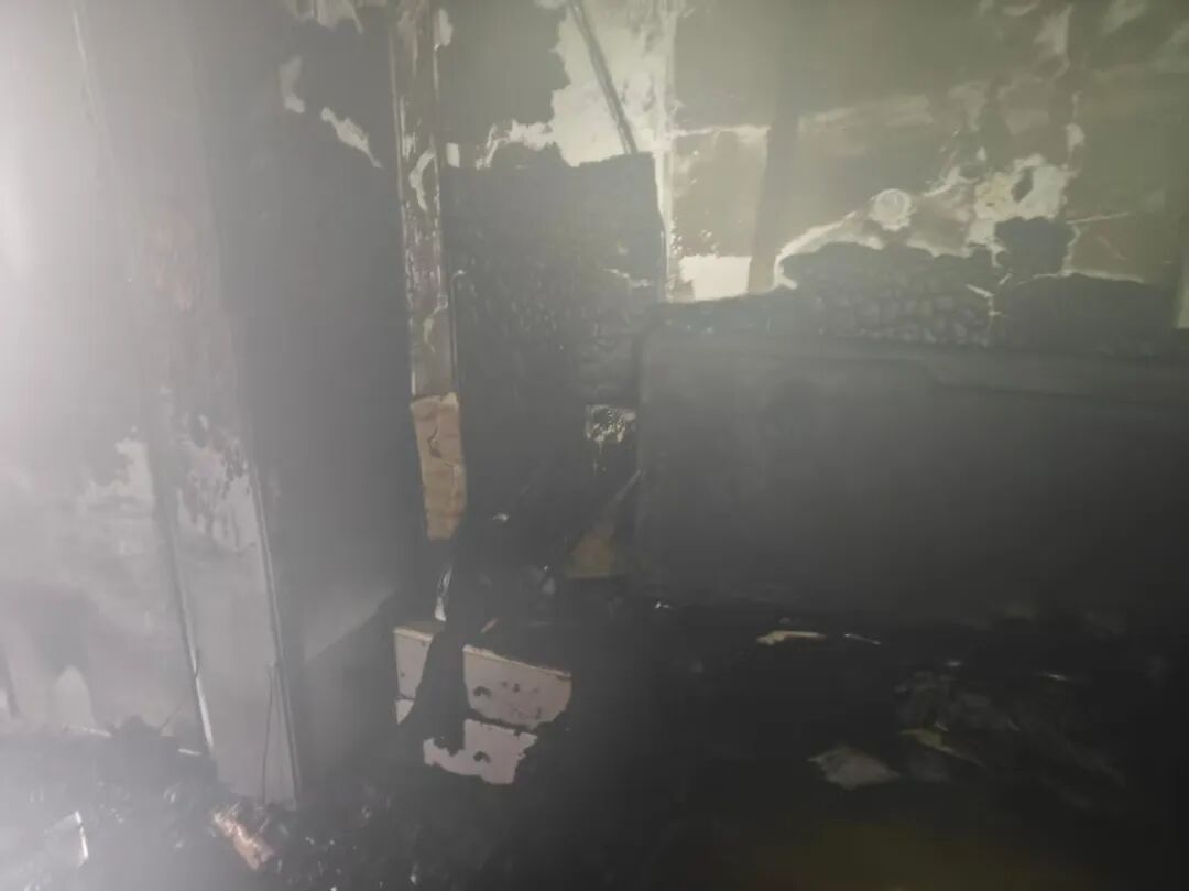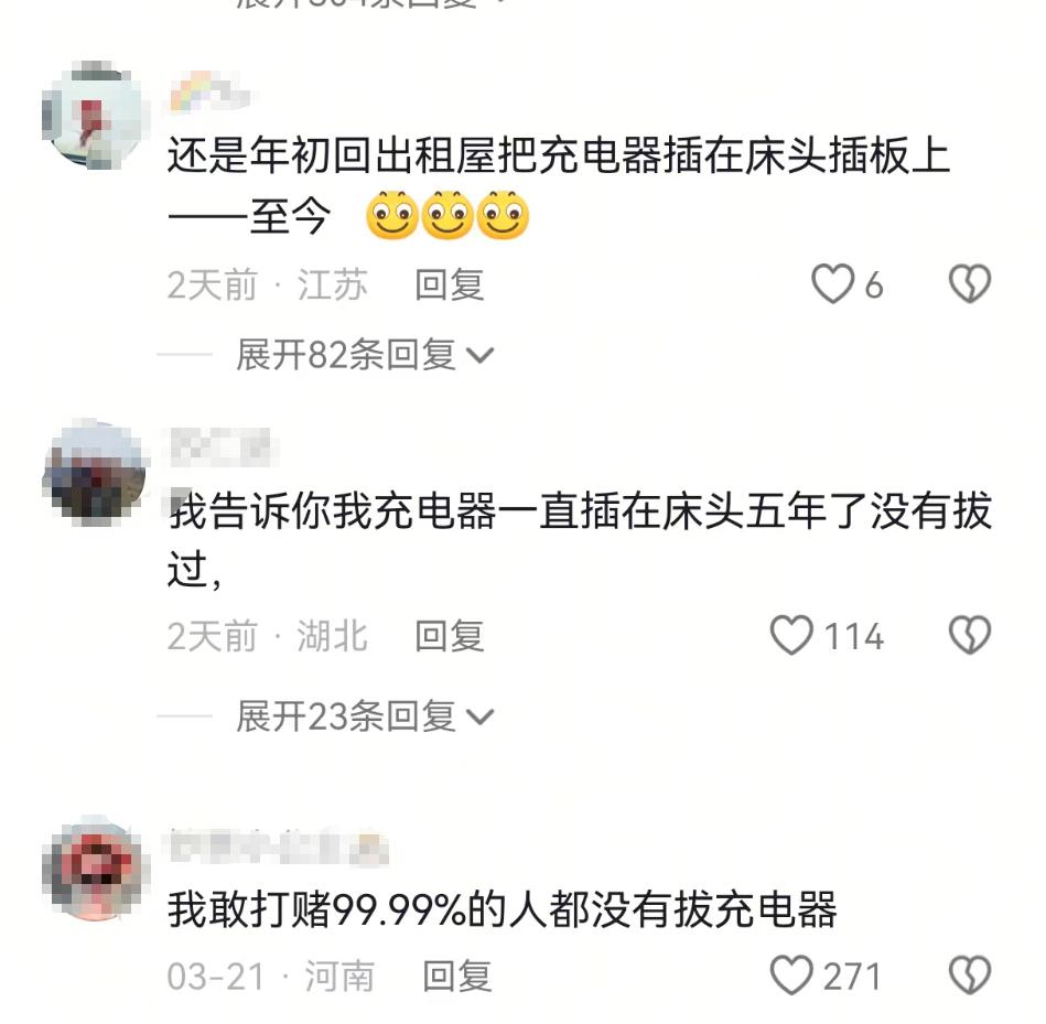 户主金先生事后反映:“ 我出门上班才十几分钟 ,家里没有其他火源, 只有床头的手机充电器一直插着没拔 ,本来是想充电方便,没想到会起火。”