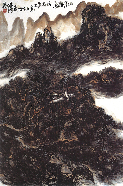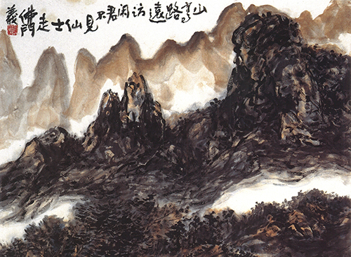 远山顶端是一波三折的题识:“山高路远访闲君,不见仙士走佛门”,书法的用笔与绘画笔法,构成了作品完整统一的格调。