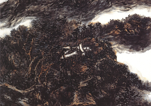 从画面用笔的力度与势态观之,落笔似有万钧之力。画者沉雄的笔力营造出厚重的山体,篆籀笔法稳健写就坚劲嶙峋的树干,树枝树叶或用刮铁皴画出、或用浑点点成。造型厚重的山岚,其线条虽然张弛有度、松动疏朗,但却有着曲铁般的力道。随着山势的由近至远,墨色也循序渐进。画面的主体,是用浓墨勾勒皴擦;天边的山峰,则用淡墨淡赭色渲染,画面也因此显得悠远苍润。这种金石味十足的画面肌理,即使在画的印刷品中也清晰可见。