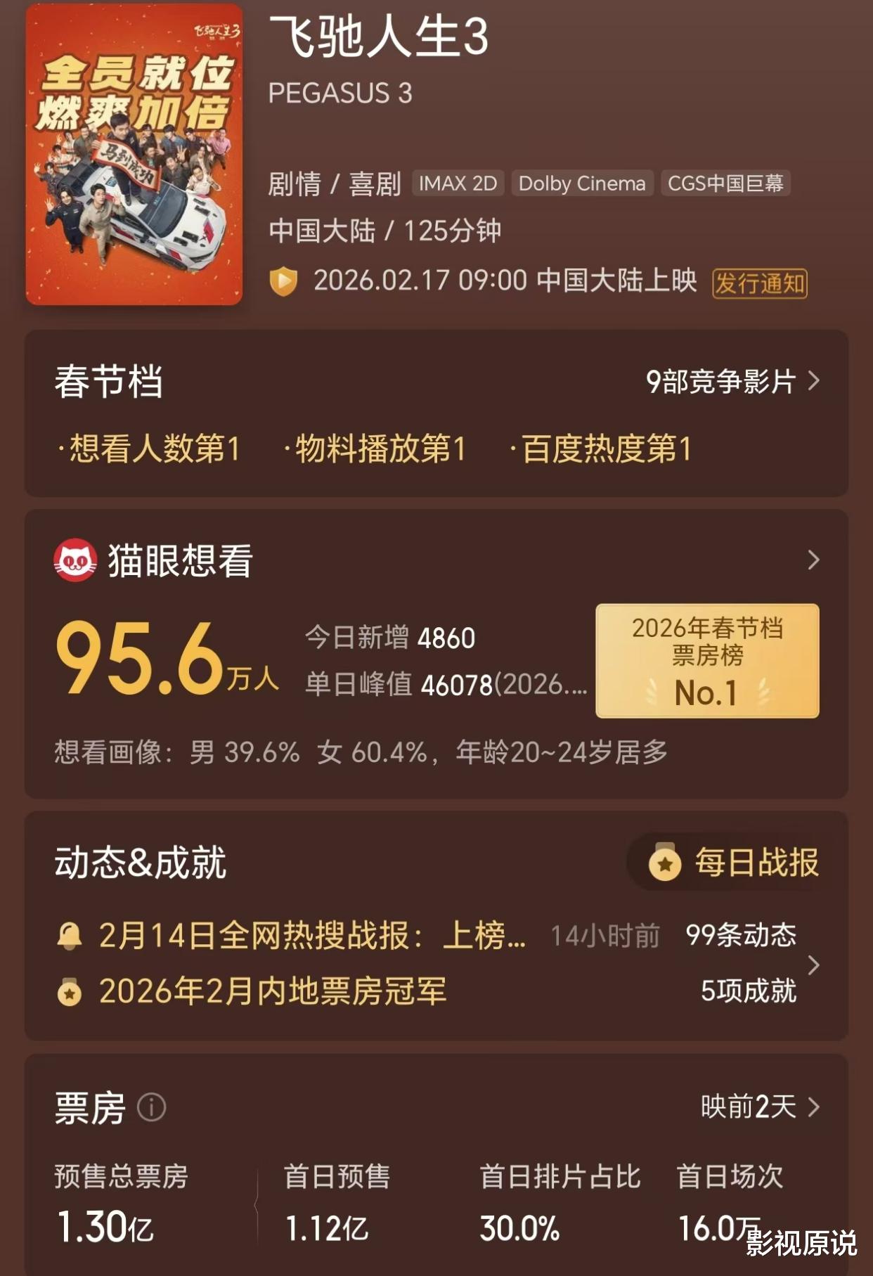 《飞驰人生3》预售总票房达1.3亿人民币,超张艺谋、吴京和成龙各自主演电影的总和,沈腾直接锁定今年春节档冠军。